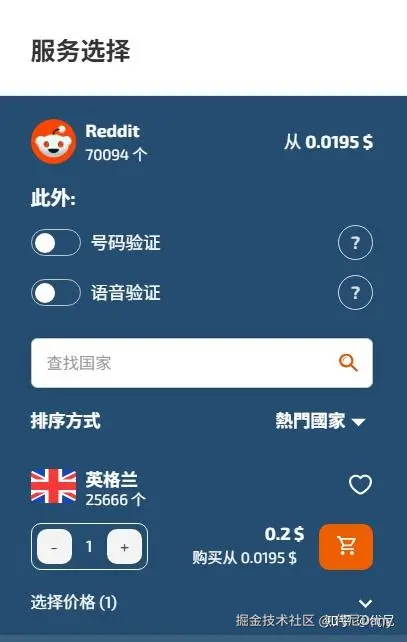 在目录中选择 “Reddit” 该服务,然后选择号码需要的国家(想注册美国账户就选择美国号码)。