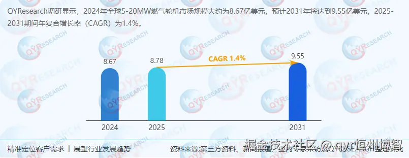 根据QYResearch最新调研报告显示,2024年全球5-20MW燃气轮机市场规模达8.67亿美元,预计2031年增至9.55亿美元,2025-2031年复合增长率(CAGR)1.4%。增长动力主要来自: