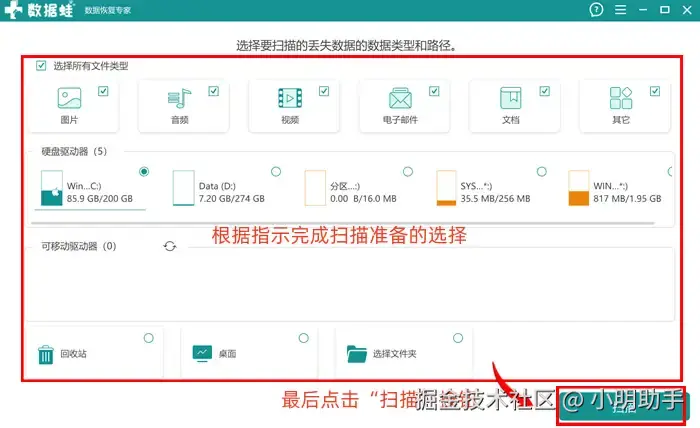 第1步: 打开软件进行首页,根据指示选择指定文件类型和位置进行扫描,类型不确定的话也可以直接全选。选好后点击“扫描”;
