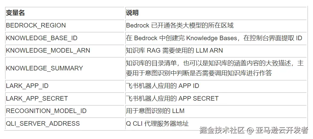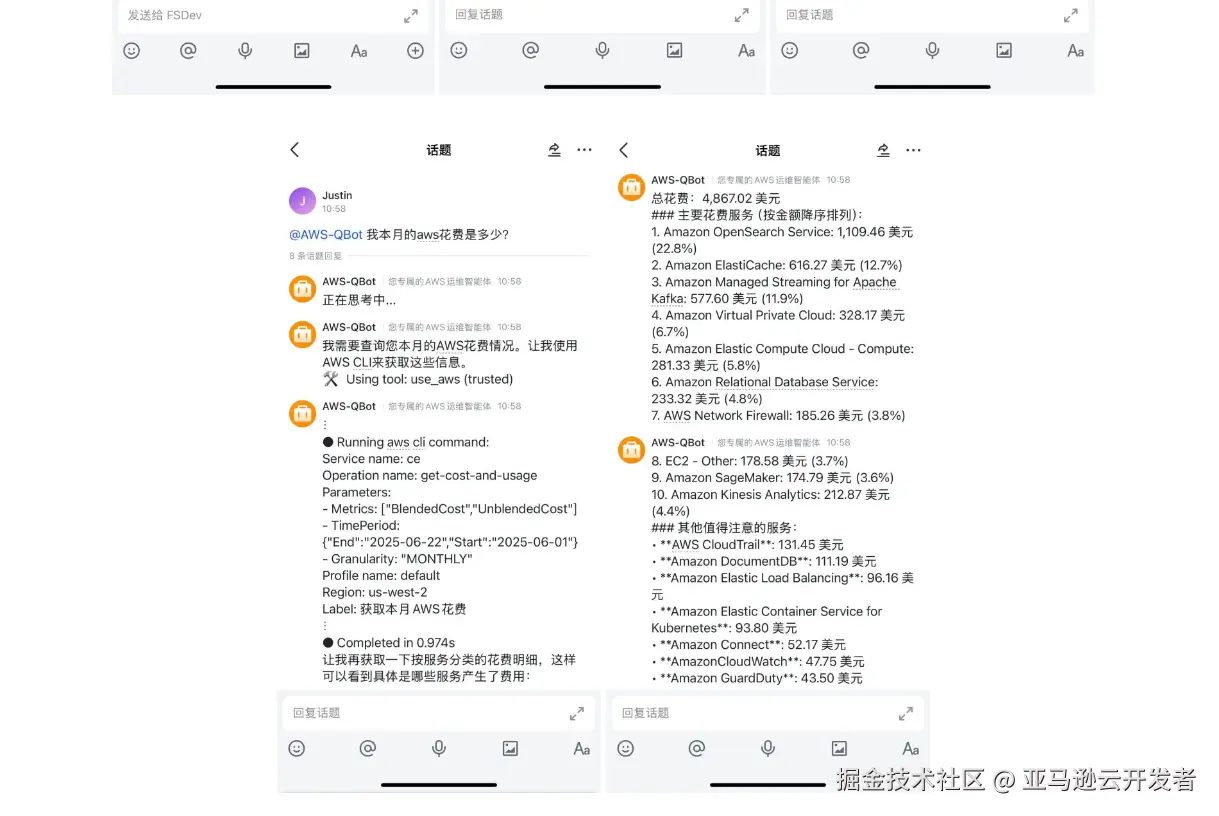 综上所述,本文以 Amazon Q Developer CLI 与 IM 工具(如飞书)的集成为例,展示了如何构建一个对话式的 AI Agent 运维平台,实现传统运维流程的智能化升级。通过接入自定义的 MCP Server,不仅扩展了 Q Developer 的能力边界,更为企业带来了更高效、更智能的运维体验。生成式 AI 不再只是技术趋势,而是可以实实在在落地、提升工作效率的工具。希望本文的示例能够为读者在自身业务场景中的运维自动化提供启发,借助 Amazon Bedrock、Q Developer 等服务,打造符合自身需求的 AI 运维解决方案,真正迈入智能运维的新阶段。