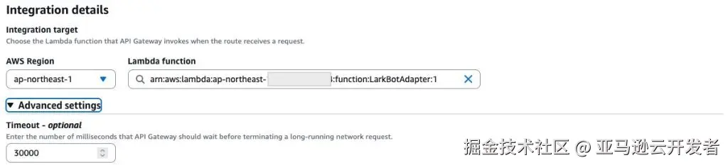 2、创建 API Gateway,构建 HTTP API,添加 / ANY 的 Route;配置 Integration,Integration target 选择 Lambda function,在下拉列表中选中 LarkBotAdapter 的 arn,并在末尾加上 :版本号 以使用 SnapStart 的版本,例如:arn:aws:lambda:us-east-1:123456789012:function:LarkBotAdapter:1;增大Integration 中的超时时间为 30 秒。
