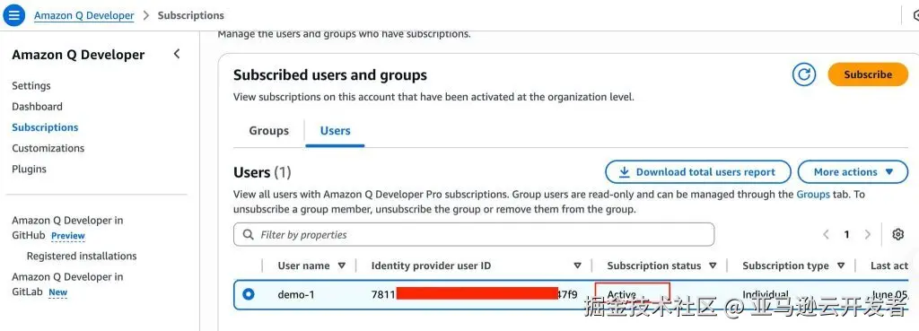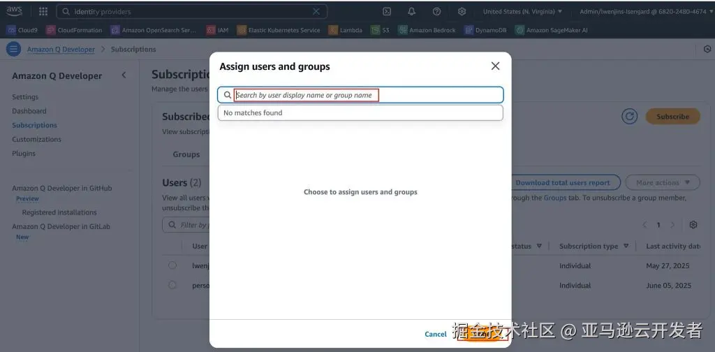4、为 Q Developer Pro 订阅用户,控制台搜索 Q Developer 点击 Subscribe,选择分配用户/组,输入上一步编辑的 Display name,找到用户后选择右下角的添加。添加完成后会看到状态为“不可用”,这是因为我们需要进行激活。