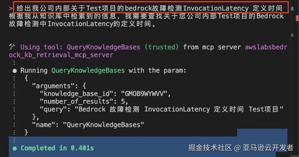比如:查询知识库,告诉我公司内部关于 Test 项目 Bedrock 模型调用延迟参数的定义信息