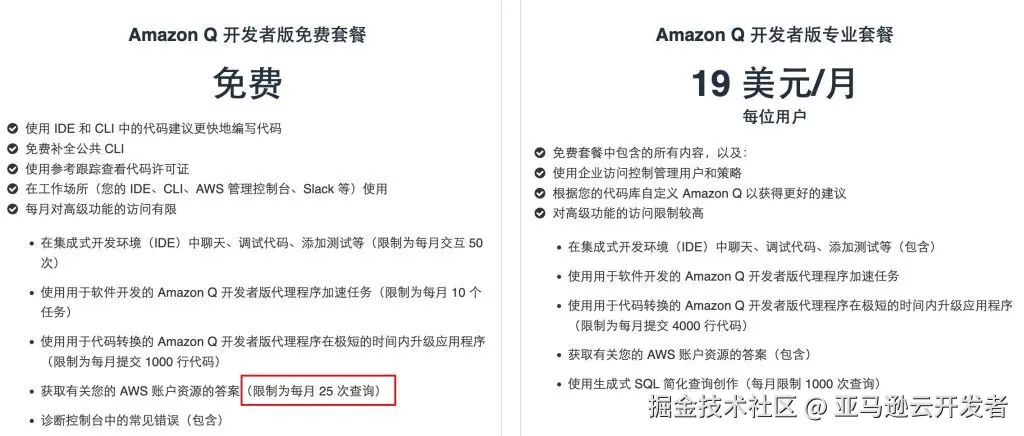 在本方案中,Q CLI 作为多用户的共用平台,所以必须开通 Pro 版本才不受配额限制。以下是免费版和 Pro 版本对比: