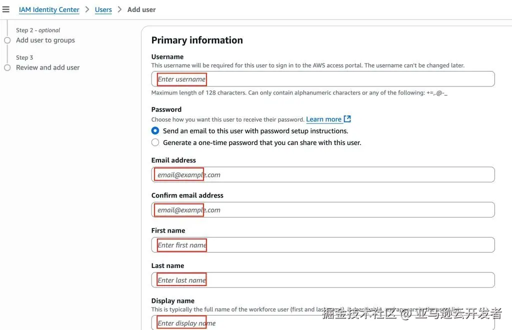 3、您会自动进入到 IAM Identity Center,在这里您需要创建用户,通过选择用户-创建用户,您需要填写以下信息: