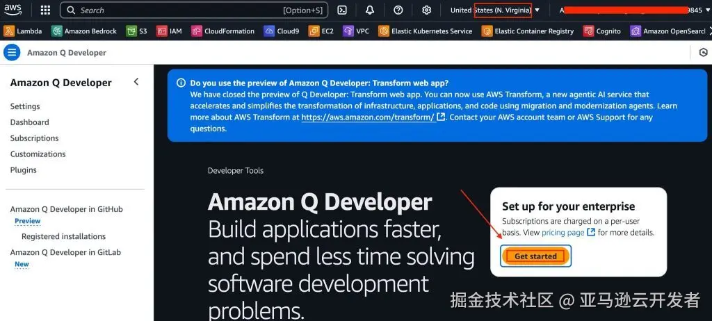 1、在亚马逊云科技控制台搜索 Amazon Q Developer,您需要确认右上角的区域为 us-east-1,点击右下角 Get started。