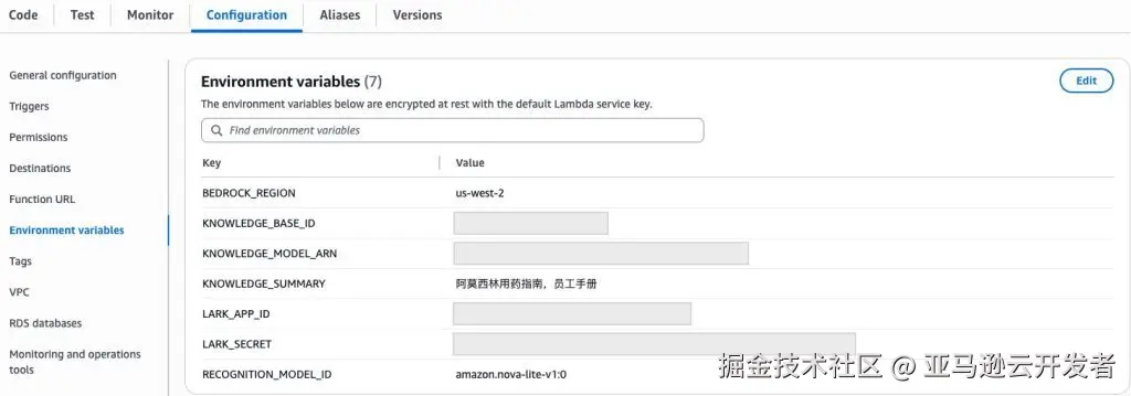 在 Lambda 的 Configuration 中点击 Environment variables ,配置如下环境变量: