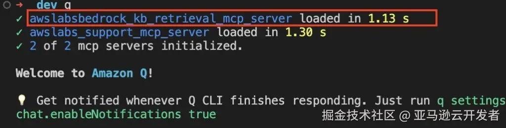 (4)配置完成后重新输入 q,就可以看到 bedrock_kb_retrieval_mcp_server 关联成功。