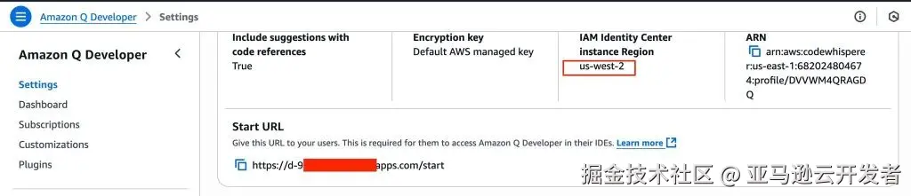 Start URL: 您可以从订阅的 Q Developer 控制台内找到