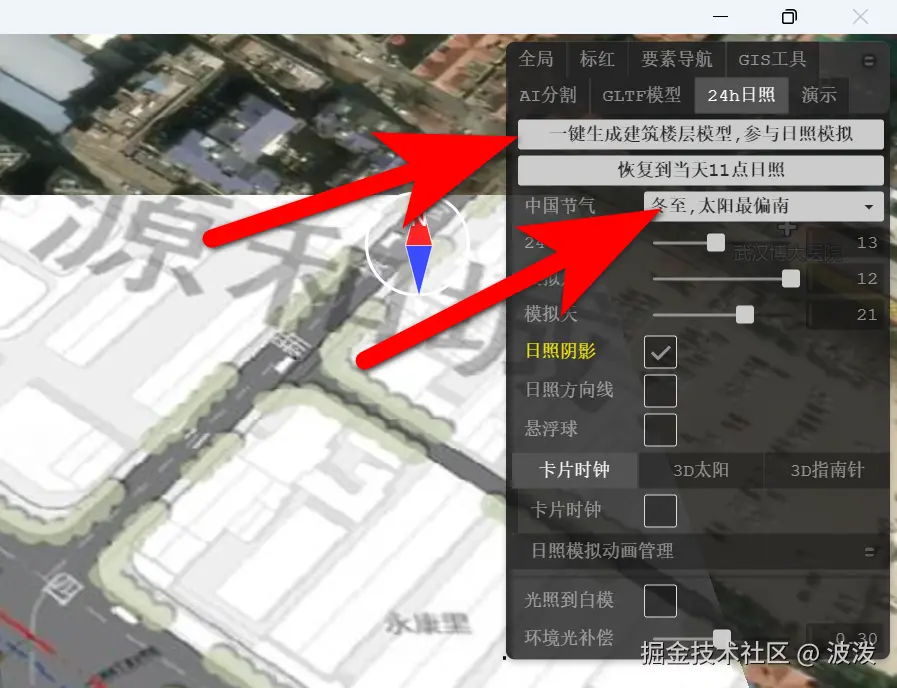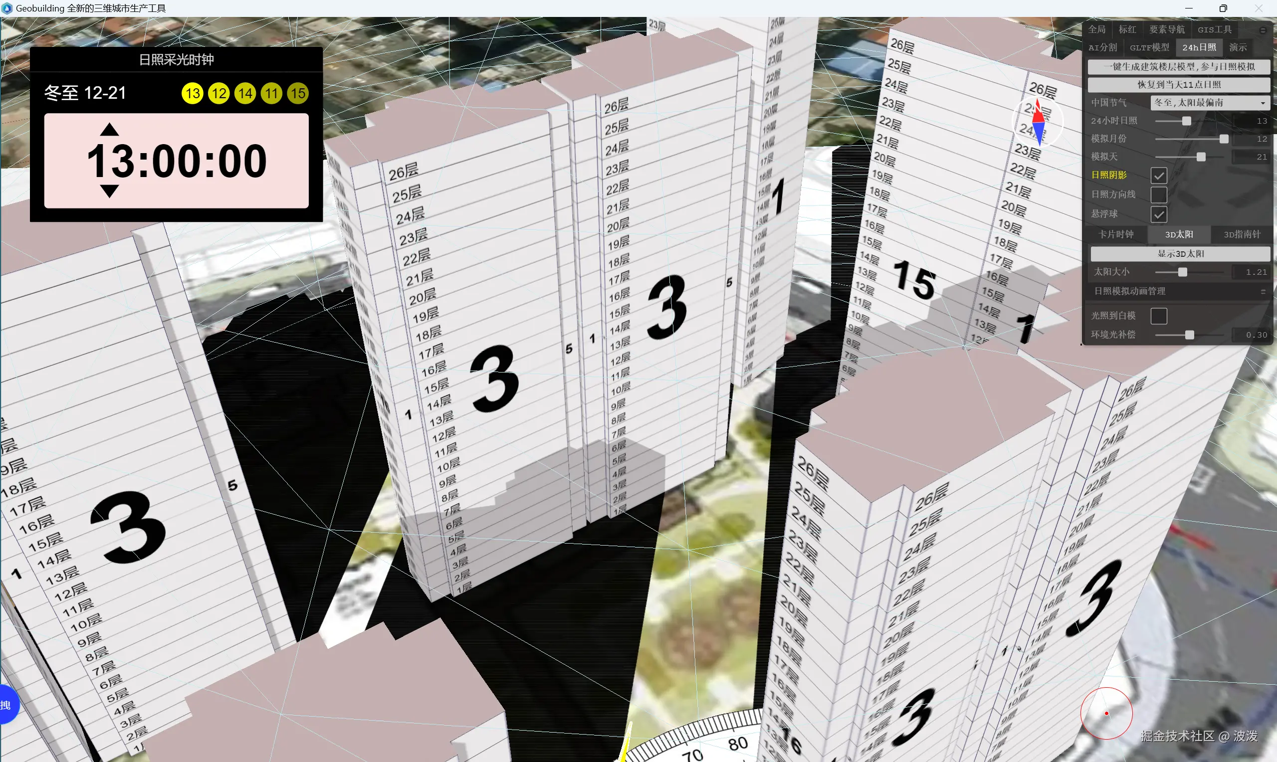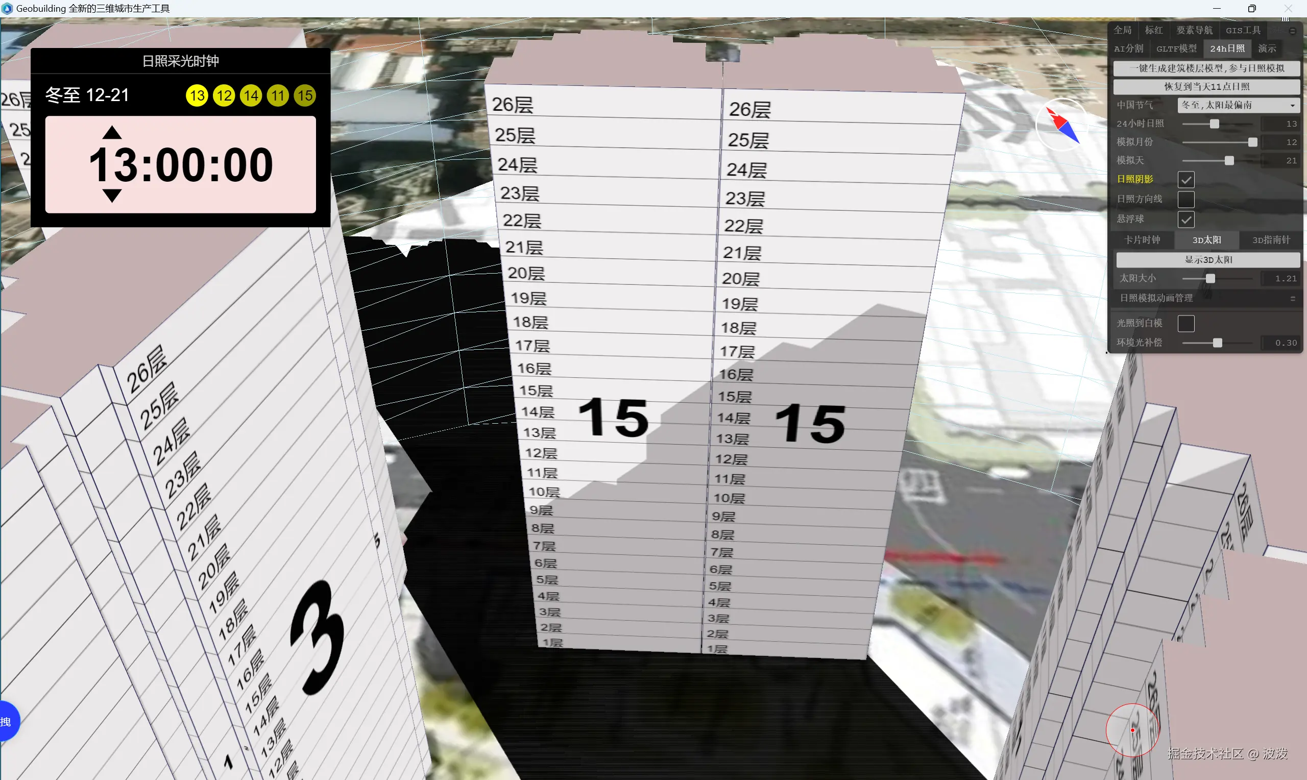 回到右上角24h日照面板。点击生成楼层模型,选择冬至时间段。