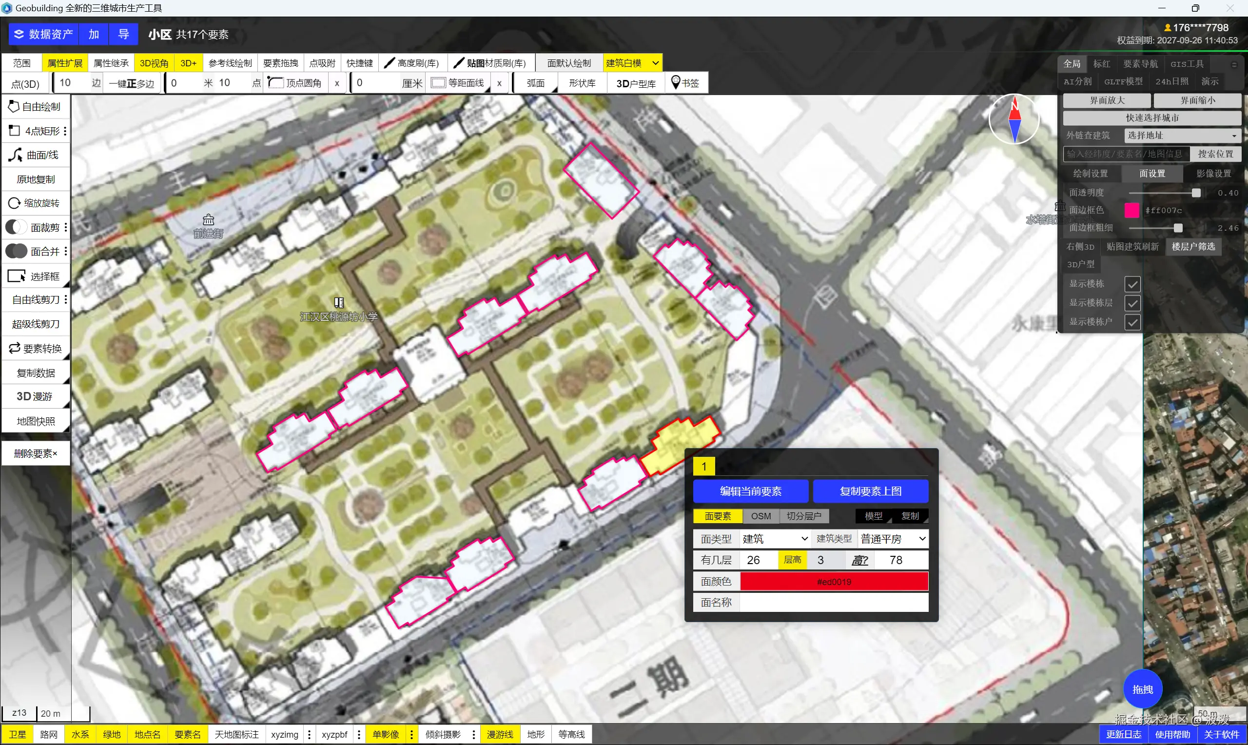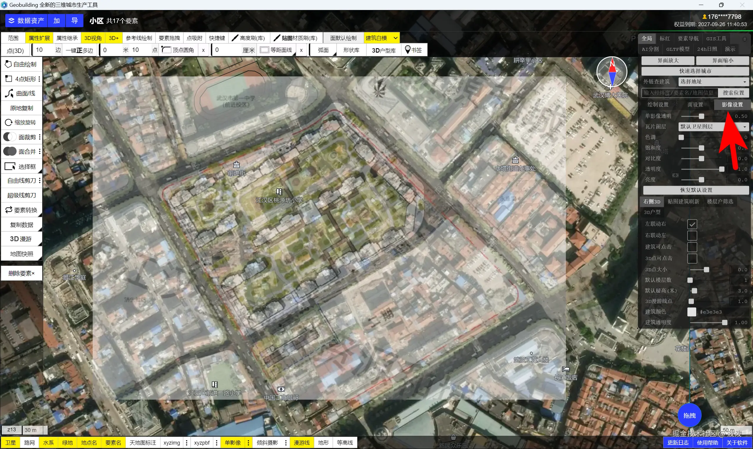 加载单影像。 配准后,在左下角【单影像】中找到 配准的图片(一般是列表中第一个),点击上图。 根据楼盘信息,楼盘高度在26层左右。绘制方法,右下角帮助查看。