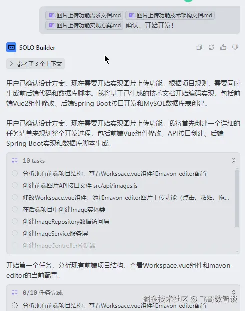 但这里我碰到一个问题,SOLO 模式的分析设计过程,好像并不是硬性规定,有时候 SOLO 可能觉得内容太过简单,直接就开始生成代码了。