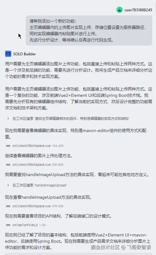SOLO 模式的一大优势是:接收到我们的指令后,它不会一上来就写代码,而是先进行需求分析和架构设计。这种“想清楚再动手”的方式,能有效避免 AI 花十几分钟生成一堆偏离需求的代码,造成时间浪费。