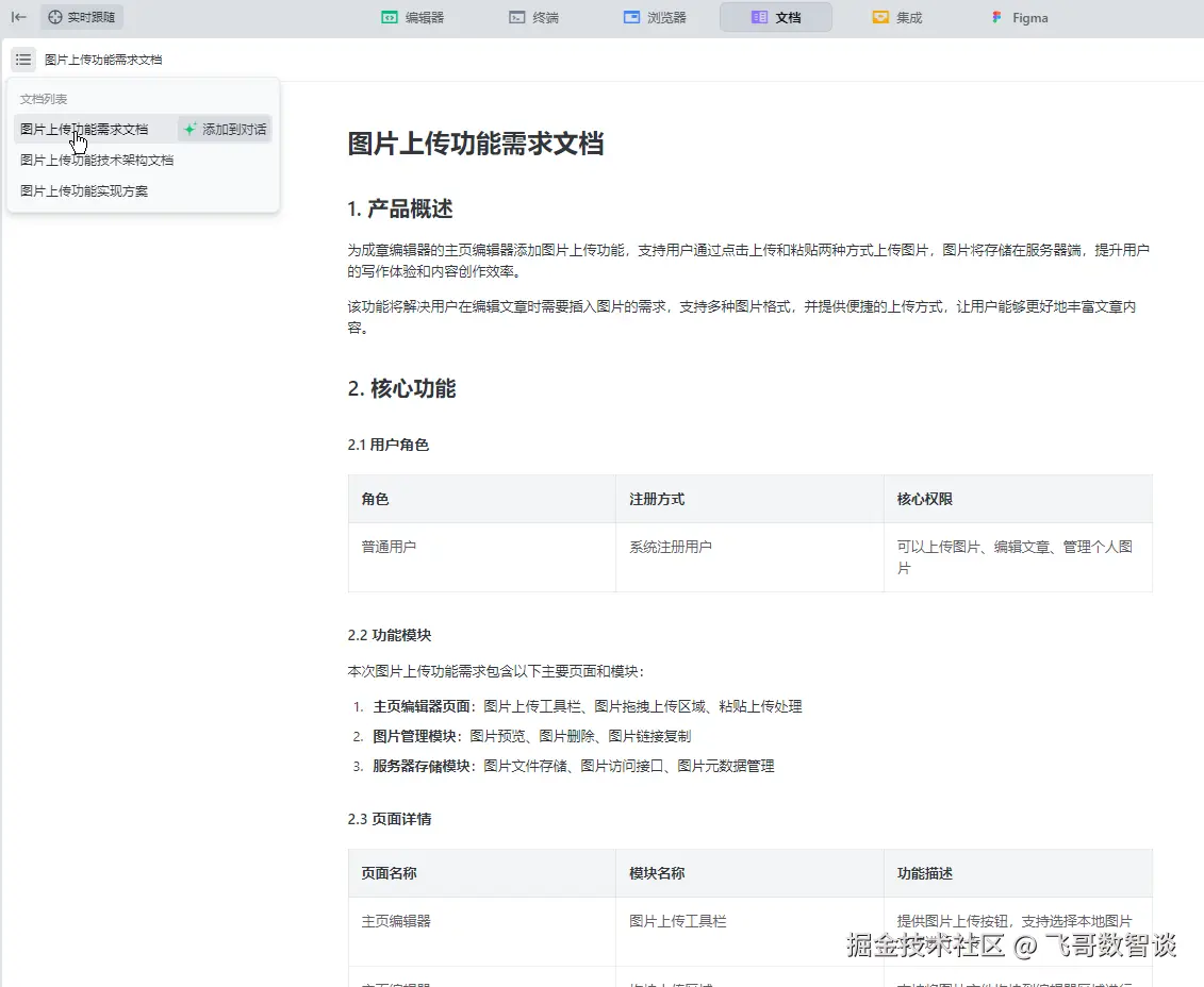 文档可以修改,全部确认后,点击“确认,开始开发”或者直接手动选择文档,发送指令。