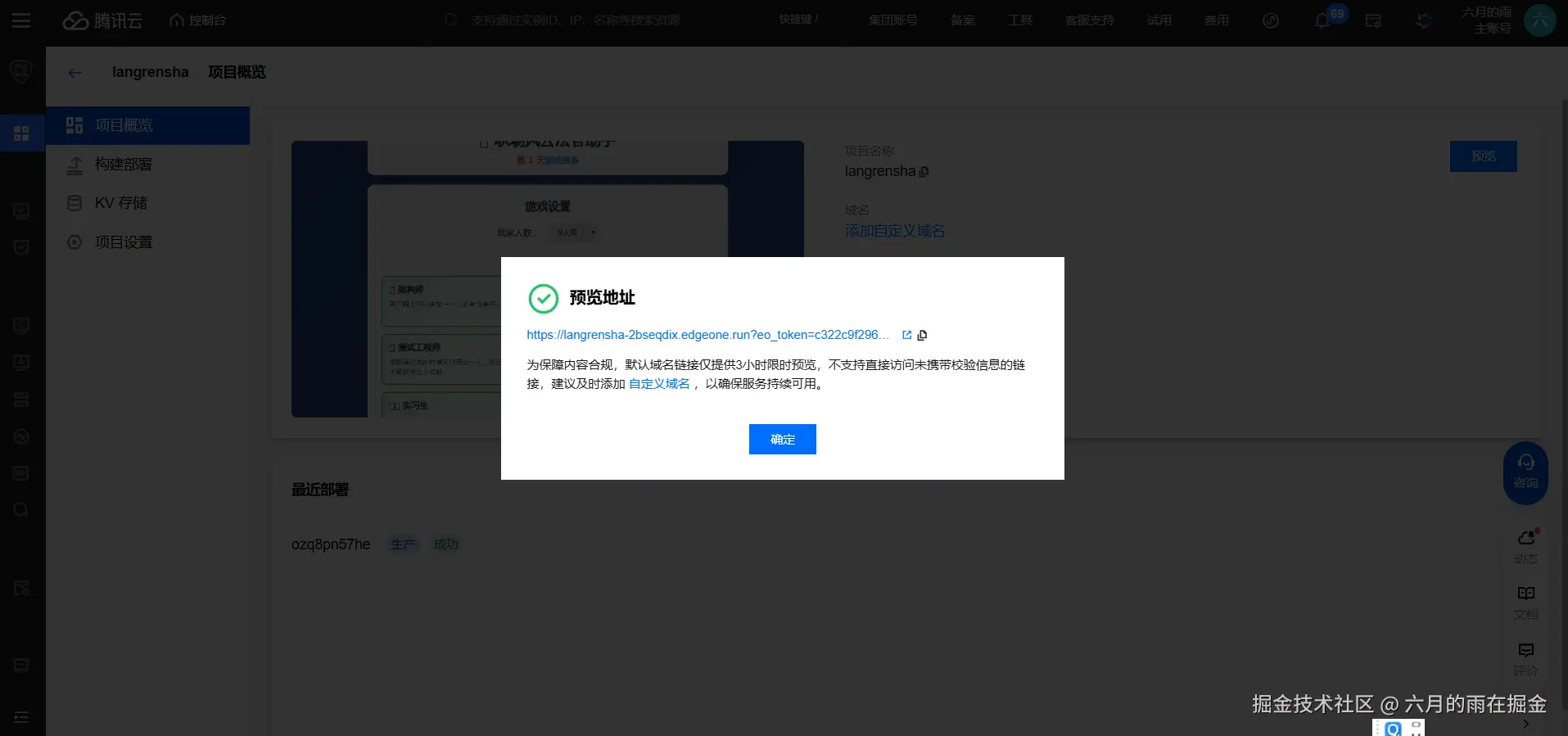 登录腾讯云 EdgeOne 控制台可以看到我们的项目信息及预览地址,需要说明的是默认域名有效期是 3 个小时,需要绑定有效域名后才可以永久访问