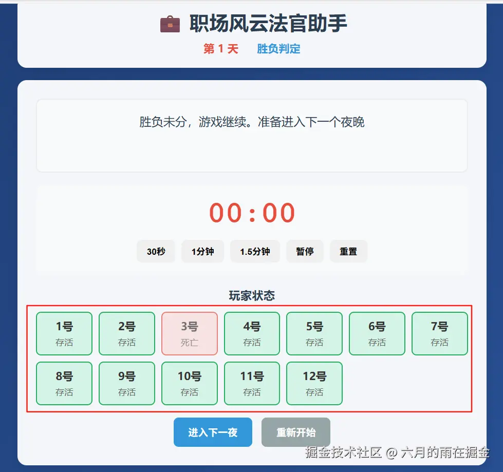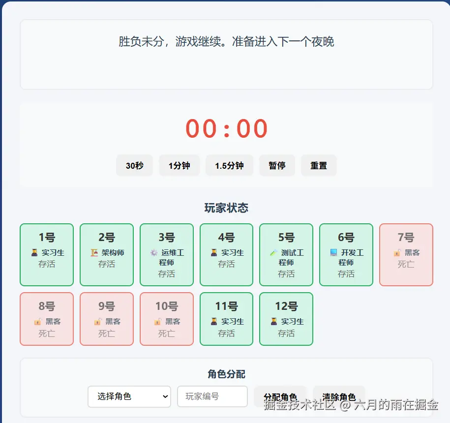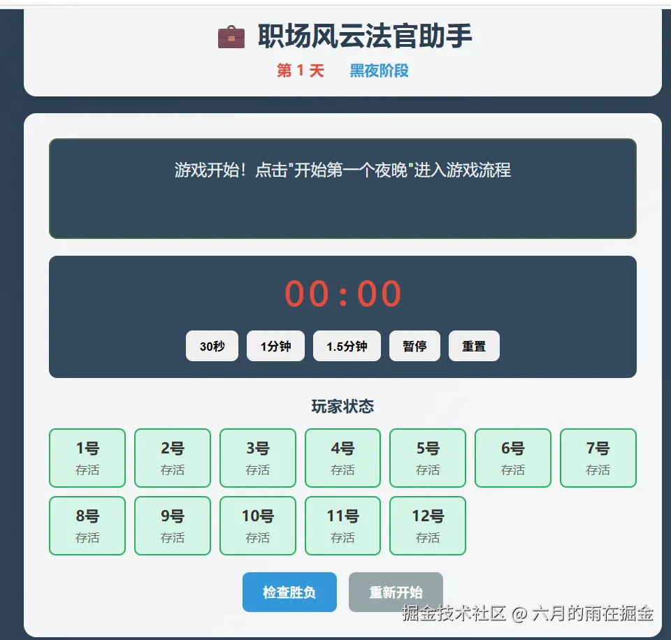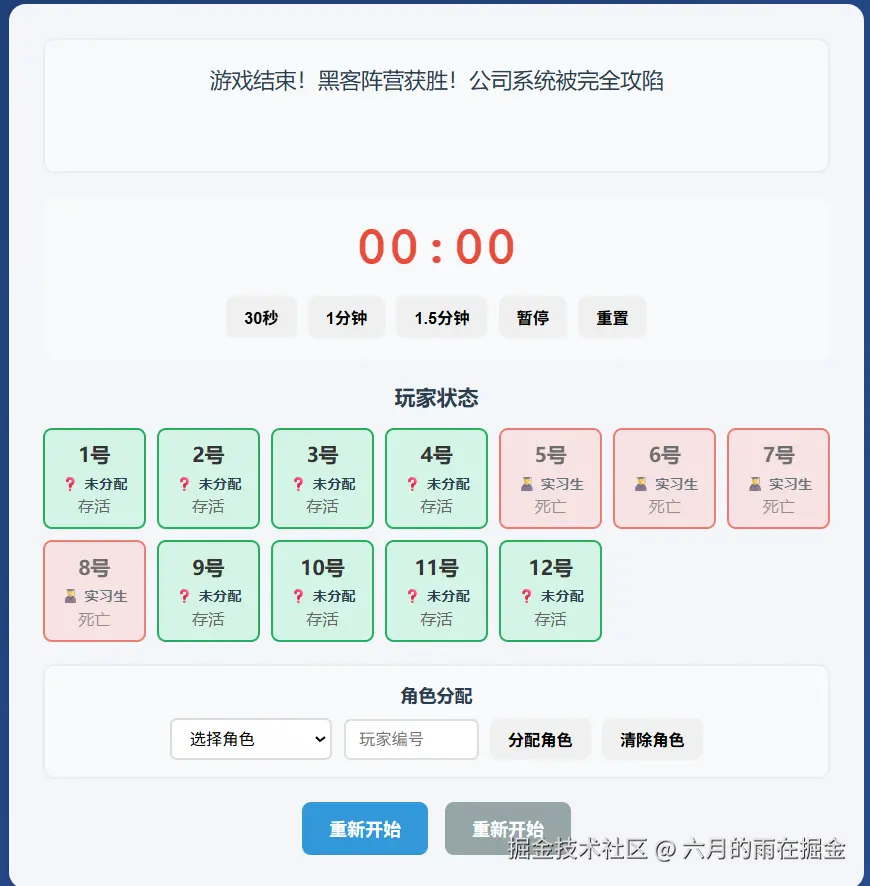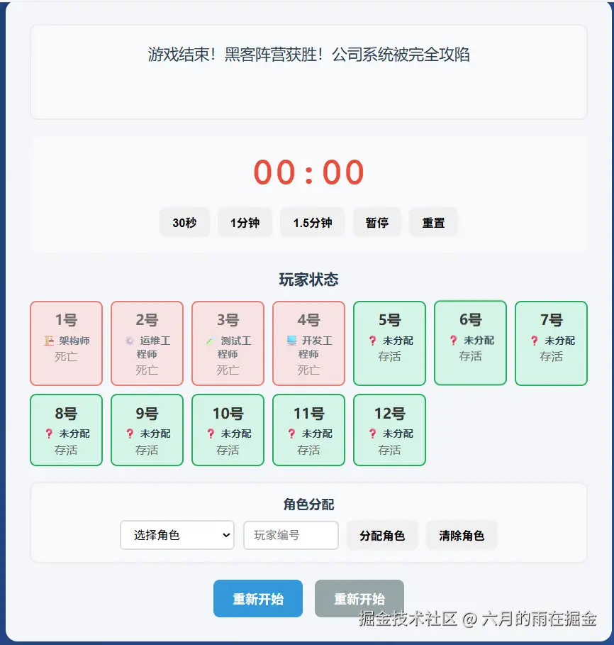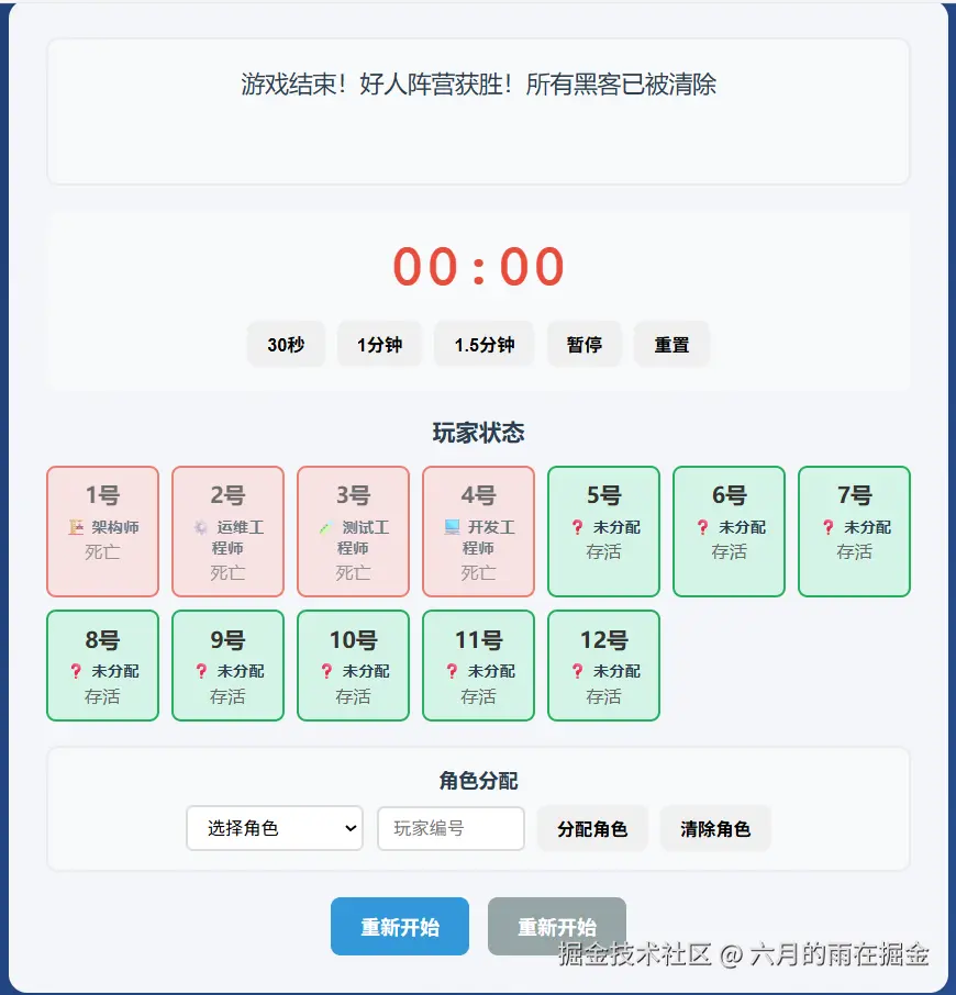 这个时候为了确定整个流程的闭环,我们来尝试一下让坏人获胜,看系统是否可以正确的判定,点击上面的【重新开始】开始新一轮游戏,并标记 【所有正职员工出局或者所有实习生出局】,下面来看看测试效果吧