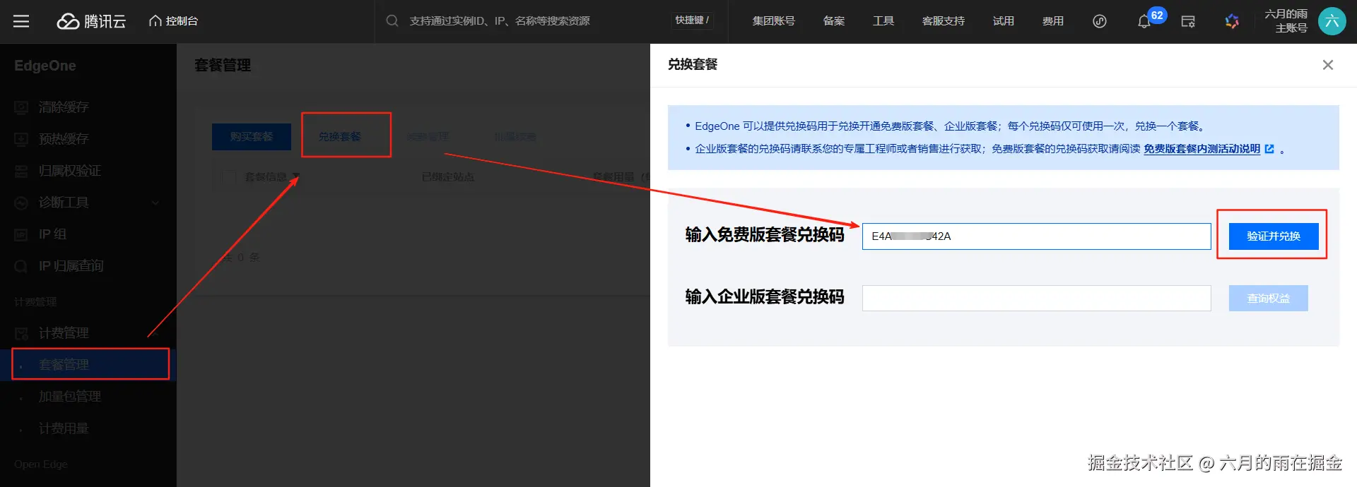 兑换码获取方式除了官方提供的两种方式之外,还有一种获取方式在文末说明。获取了兑换码之后,我们就可以登录我们的腾讯云 EO 控制台来对话免费 EO 套餐了。控制台地址:console.cloud.tencent.com/edgeone/pac… 选择【计费管理】-【套餐管理】-【兑换套餐】