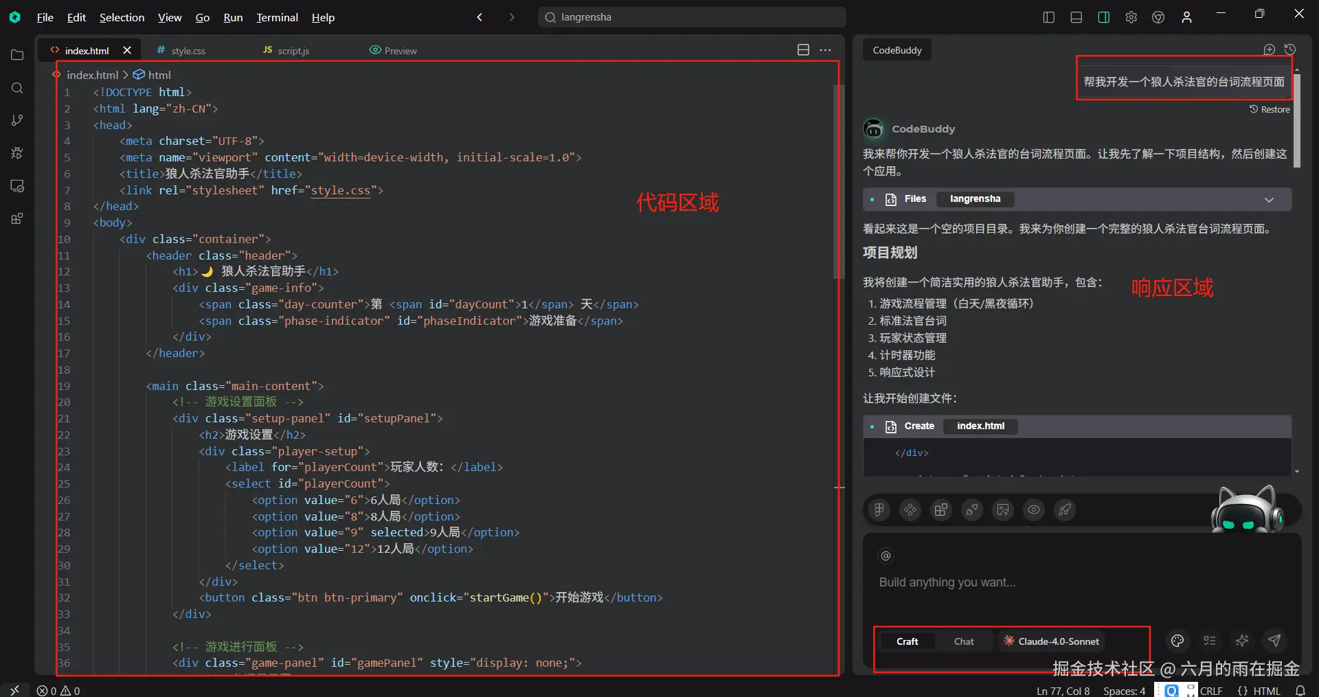 这里我们就简单给出我们的需求,然后后面再慢慢补充完善。需求内容:【帮我开发一个狼人杀法官的台词流程页面】输入需求后,CodeBuddy IDE 的 AI 辅助助手会自动帮助我们生成我们需要的内容