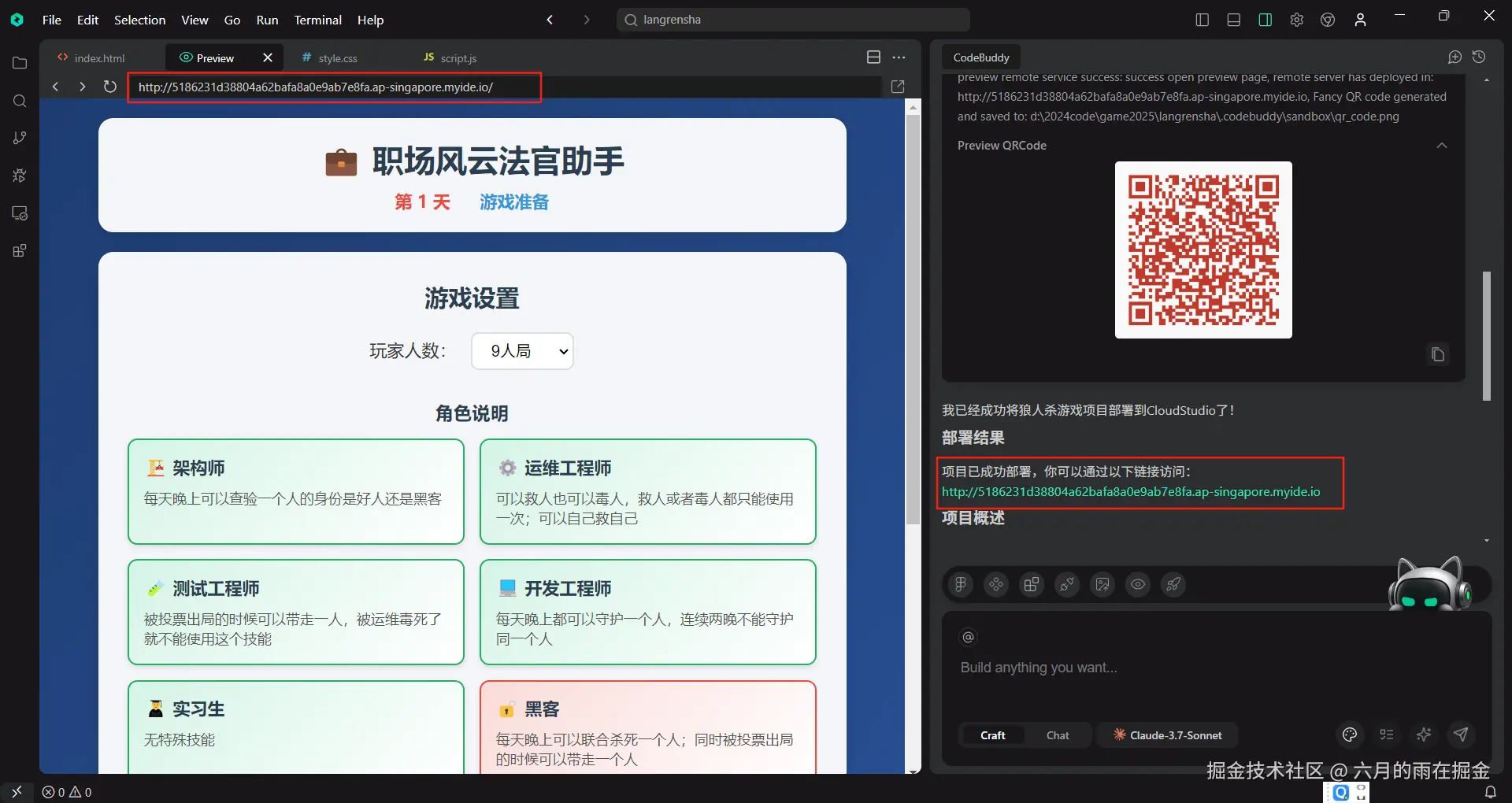 在这里点击 【Deploy】后,AI 会自动执行发布我们的工程师版本狼人杀到 Cloud Studio 项目空间的操作,等待发布成功获取访问链接就可以了 5186231d38804a62bafa8a0e9ab7e8fa.ap-singapore.myide.io