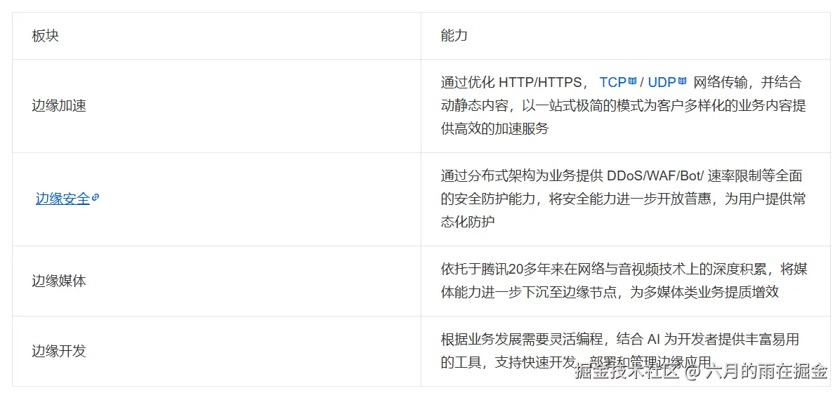 EdgeOne 主要为用户提供 DDoS 防护、 CC 攻击防护、Web 防护、Bot 管理、CDN、静态内容加速、动静态混合智能加速、边缘函数、四层代理、DNS 解析等丰富能力