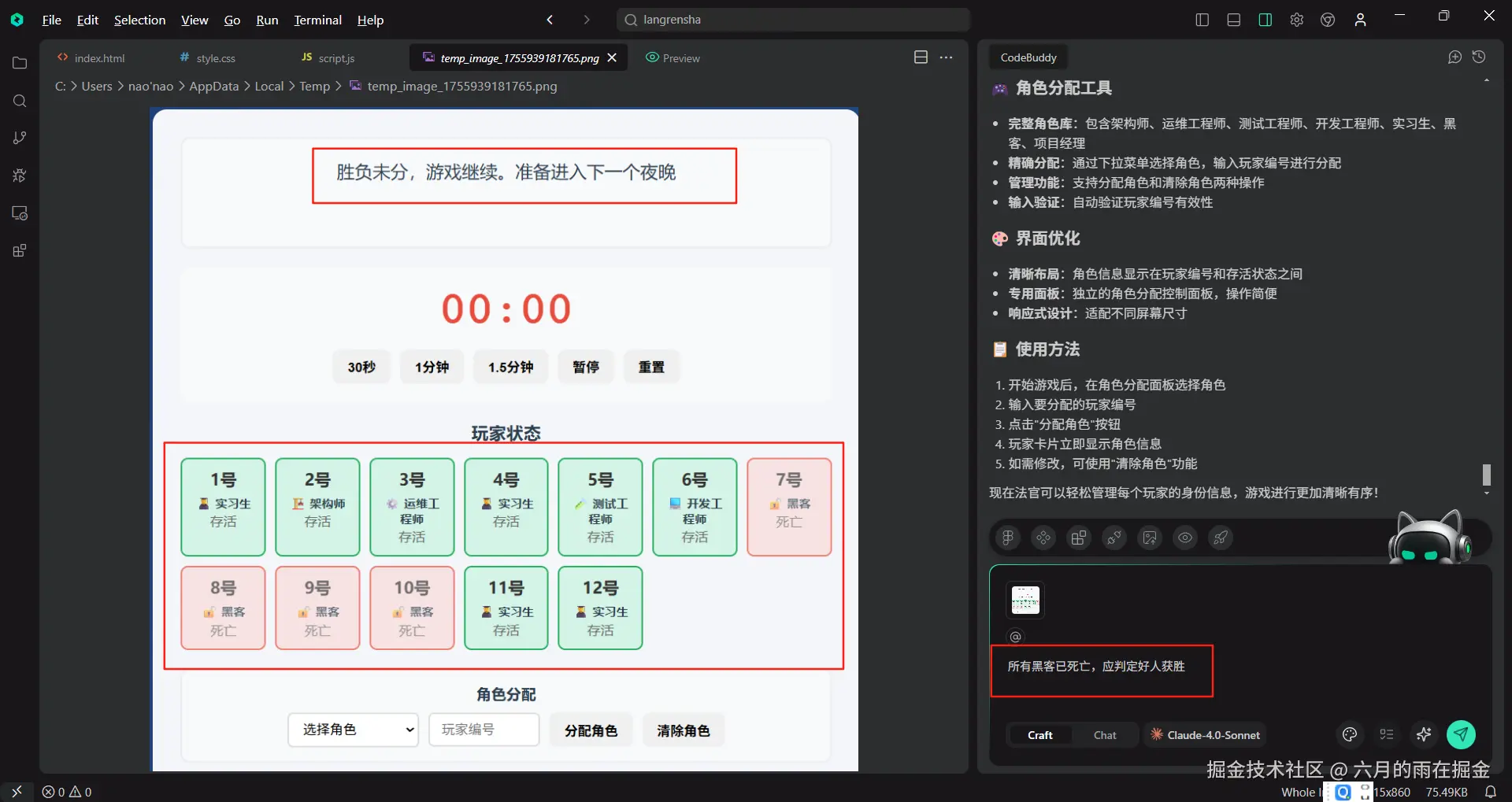 随后重点描述了版本迭代过程:将传统狼人杀角色替换为工程师特色角色(架构师、运维工程师、黑客等),并增加了夜间行动按钮、身份展示功能和胜负判定逻辑优化。通过多次与 AI 交互调试,最终实现了符合特殊获胜条件(正职员工/实习生出局或黑客全灭)的判定系统。