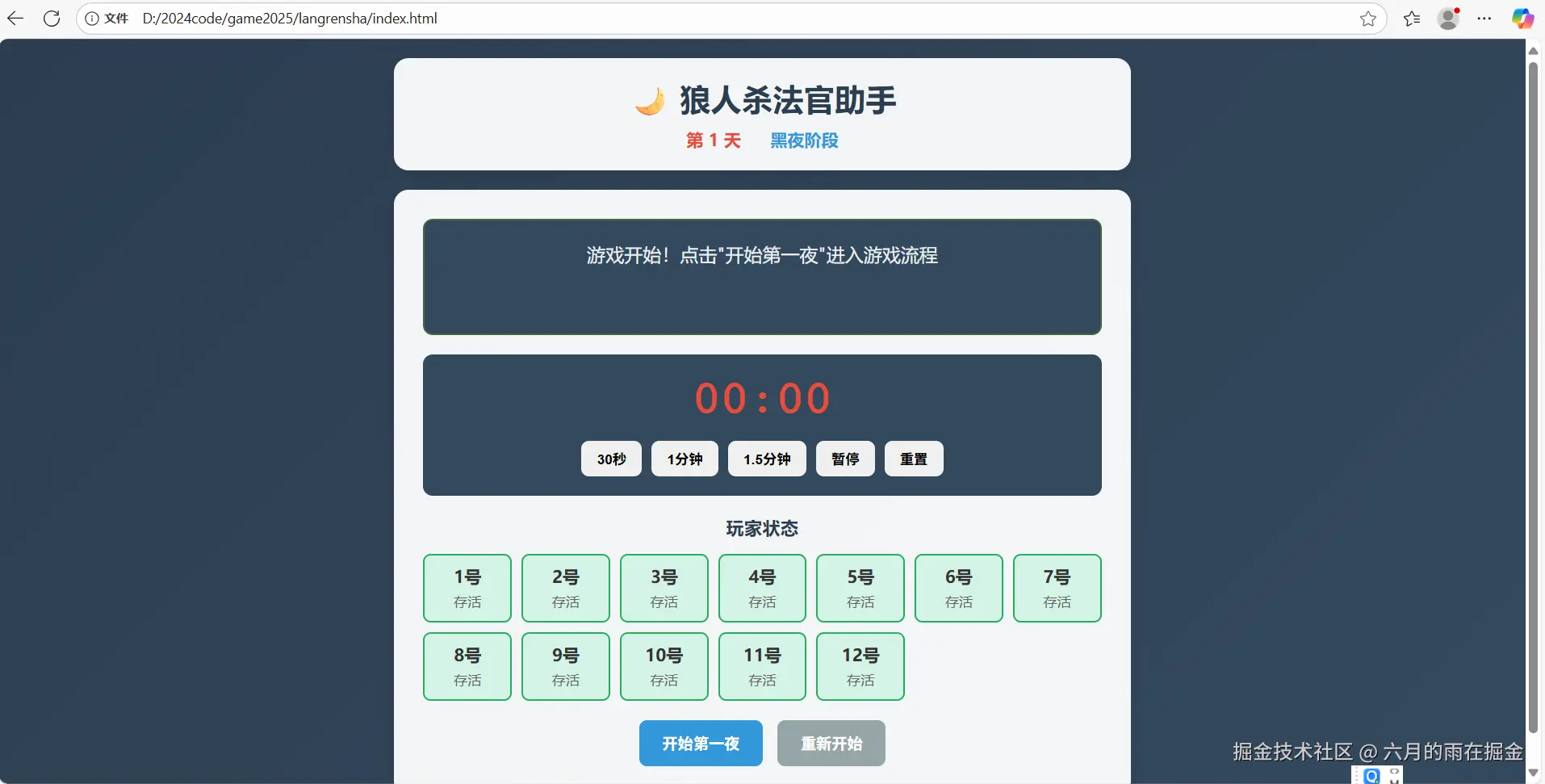 等待工程师版本狼人杀角色替换之后,在本地打开页面后,就可以看到如下的游戏页面了