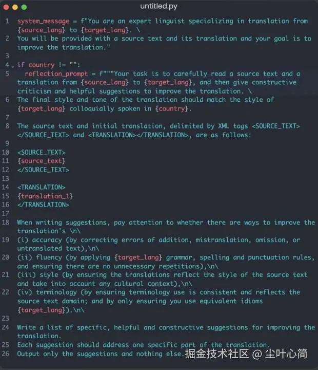 基于反思工作流的智能翻译Agent,模拟了人类翻译专家的思考过程,分成三个流程。 核心流程: 1.初始翻译:利用LLM对文本进行初步翻译,得到初步的翻译结果 2.翻译与改进:引导LLM对自身翻译结果进行反思,并提出修改意见,例如不准确、不流畅和语言习惯等问题 3.优化输出:根据LLM提出的改进意见对翻译结果再次进行优化,得到最终结果
