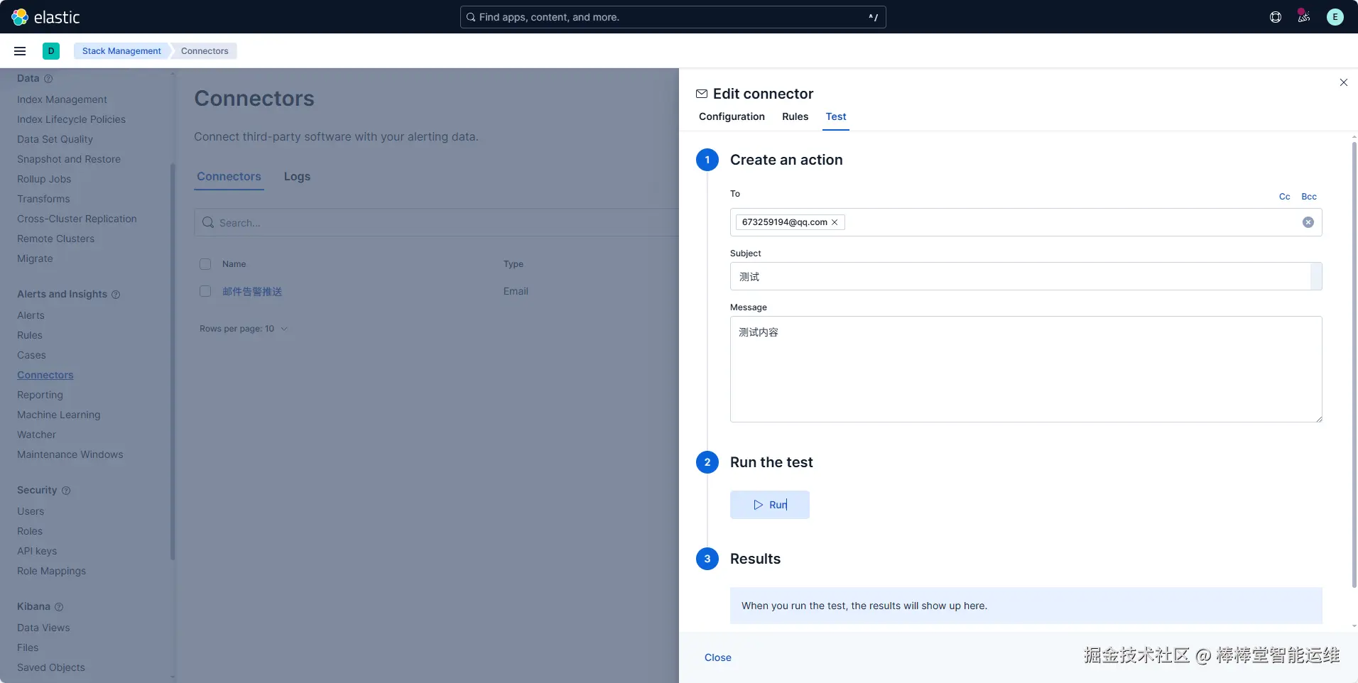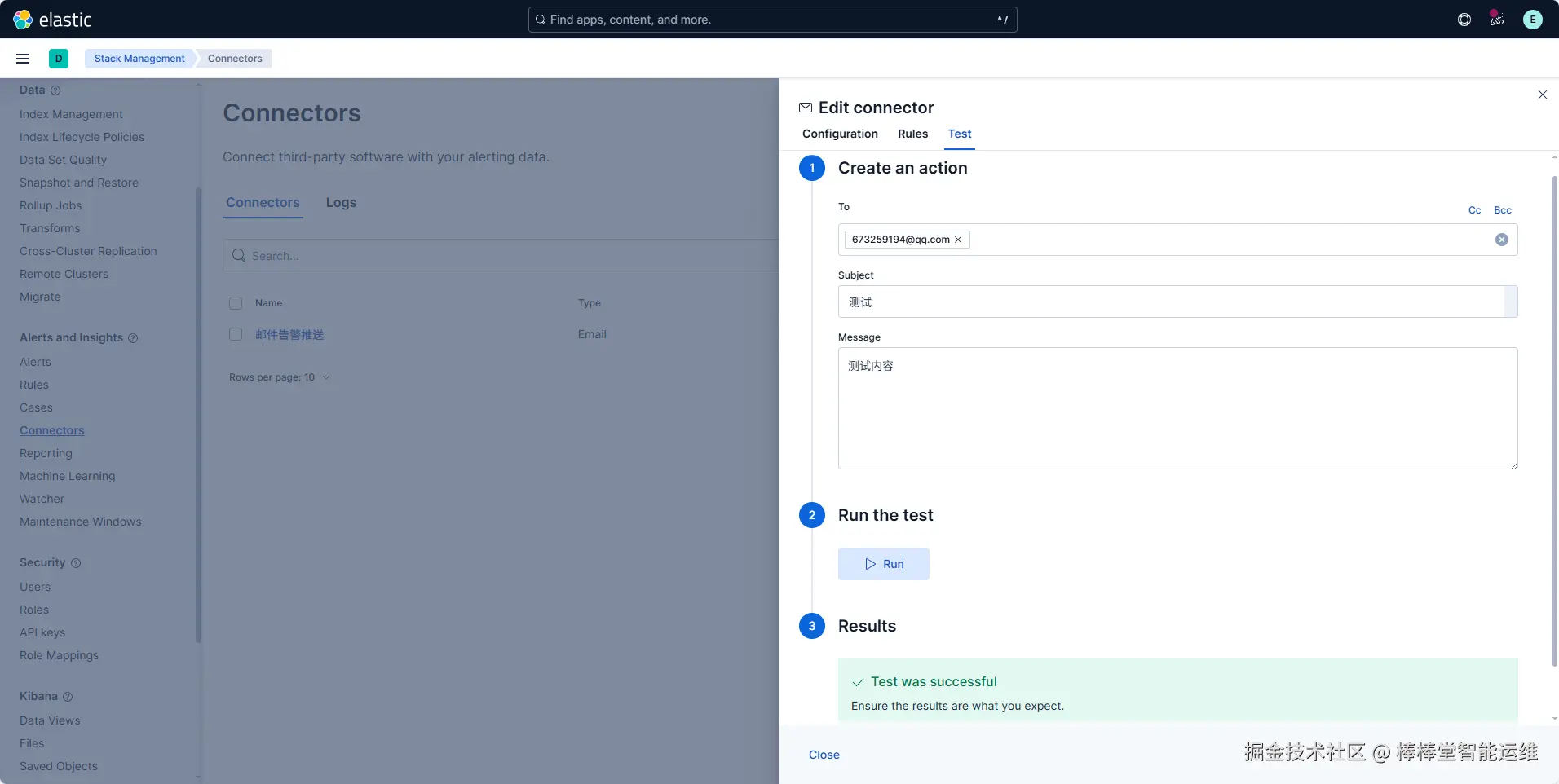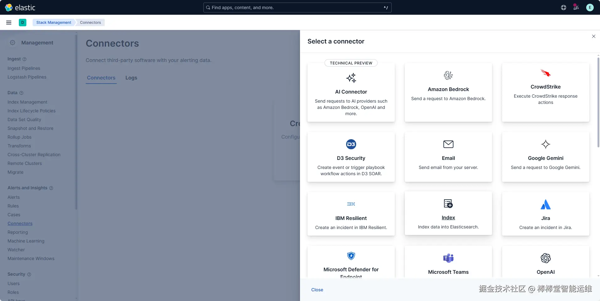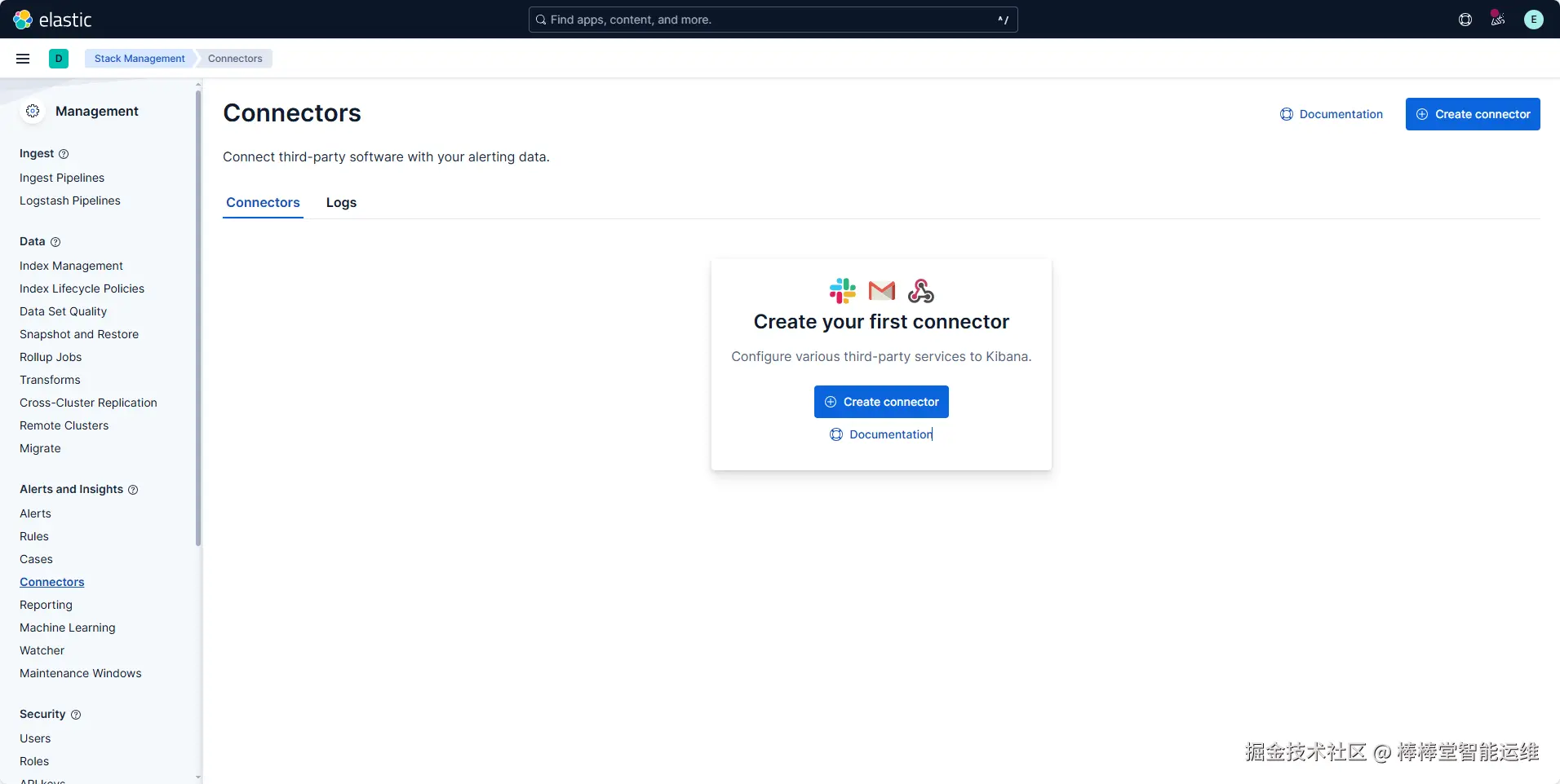 (1)在Kibana的Home界面,单击左上角的三条横线,导航到左侧菜单,下滑选择“Management”选项卡中“Stack Management”选项,选择“Alerts and Insights”菜单下的“Connectors”,配置与其他系统(如电子邮件、Slack、ServiceNow、Webhook等)的连接,用于告警通知或数据交互,如图3-10所示。