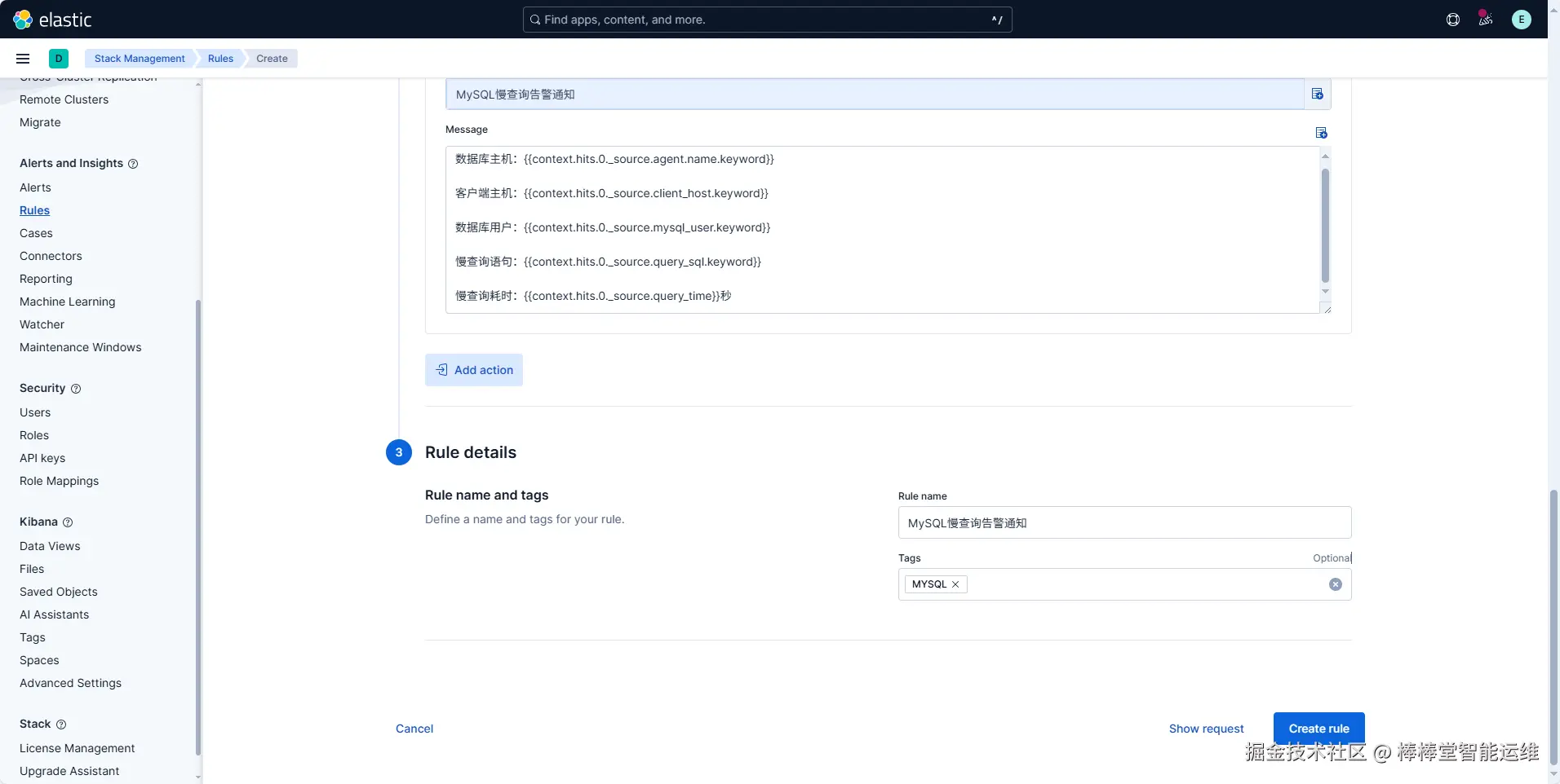(8)在“Elasticsearch query rule”配置页面,配置使用Elasticsearch SQL查询MySQL慢查询日志,并将慢查询日志通过“Email”连接器发送给指定的邮箱地址,设置规则名称和标签,单击【Create rule】创建规则,如图3-18、3-19、3-20所示。