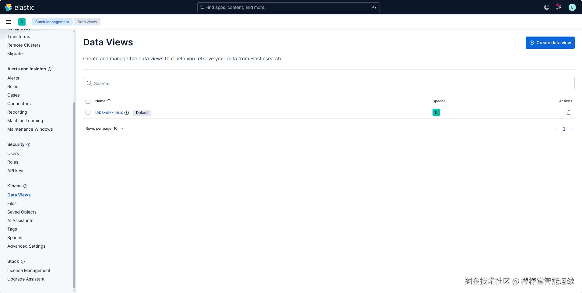 (3)在“Stack Management”界面,选择“Kibana”选项卡中“Data Views”选项,创建和管理数据视图,如图3-3所示。