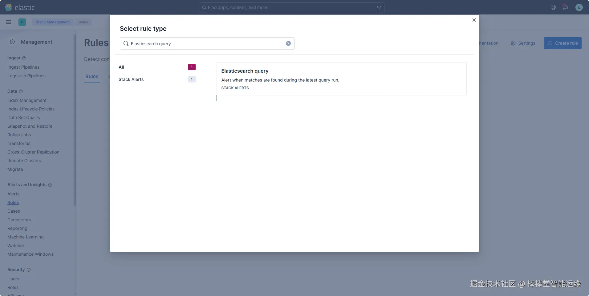 (7)在“Select rule type”页面,选择并单击“Elasticsearch query”,选择告警规则类型为弹性搜素查询,如图3-17所示。