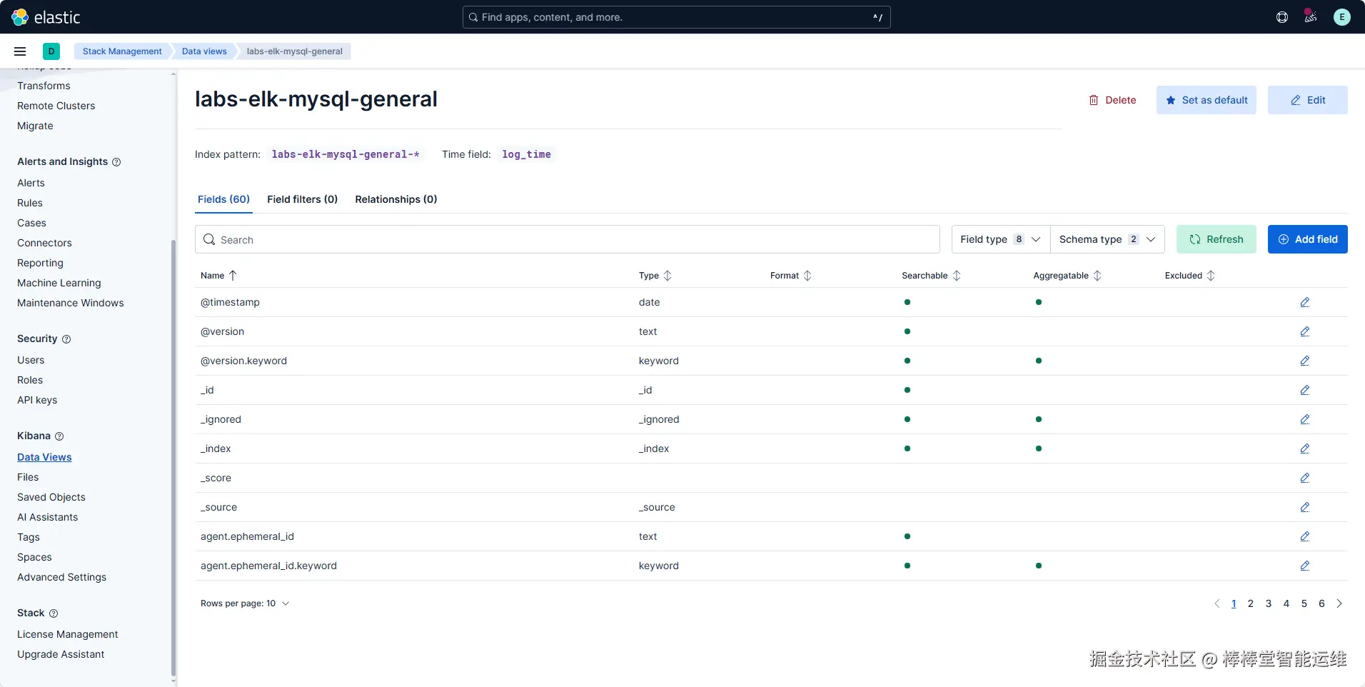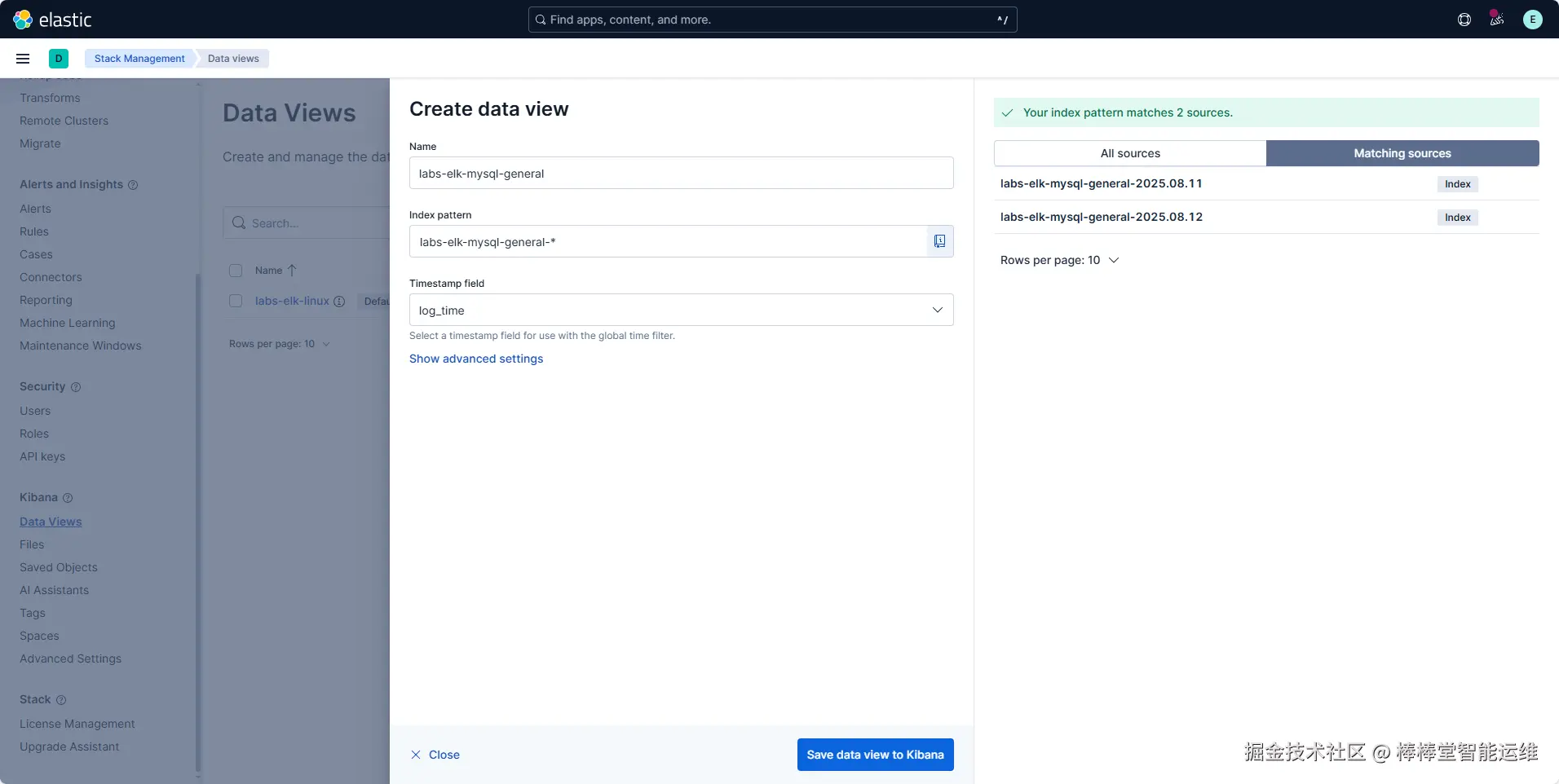 (5)输入视图名称为“labs-elk-mysql-general”,索引模式为“labs-elk-mysql-general-*”,Timestamp字段选择“log_time”,单击【Save data view to Kibana】,保存视图配置,如图3-5、3-6所示。