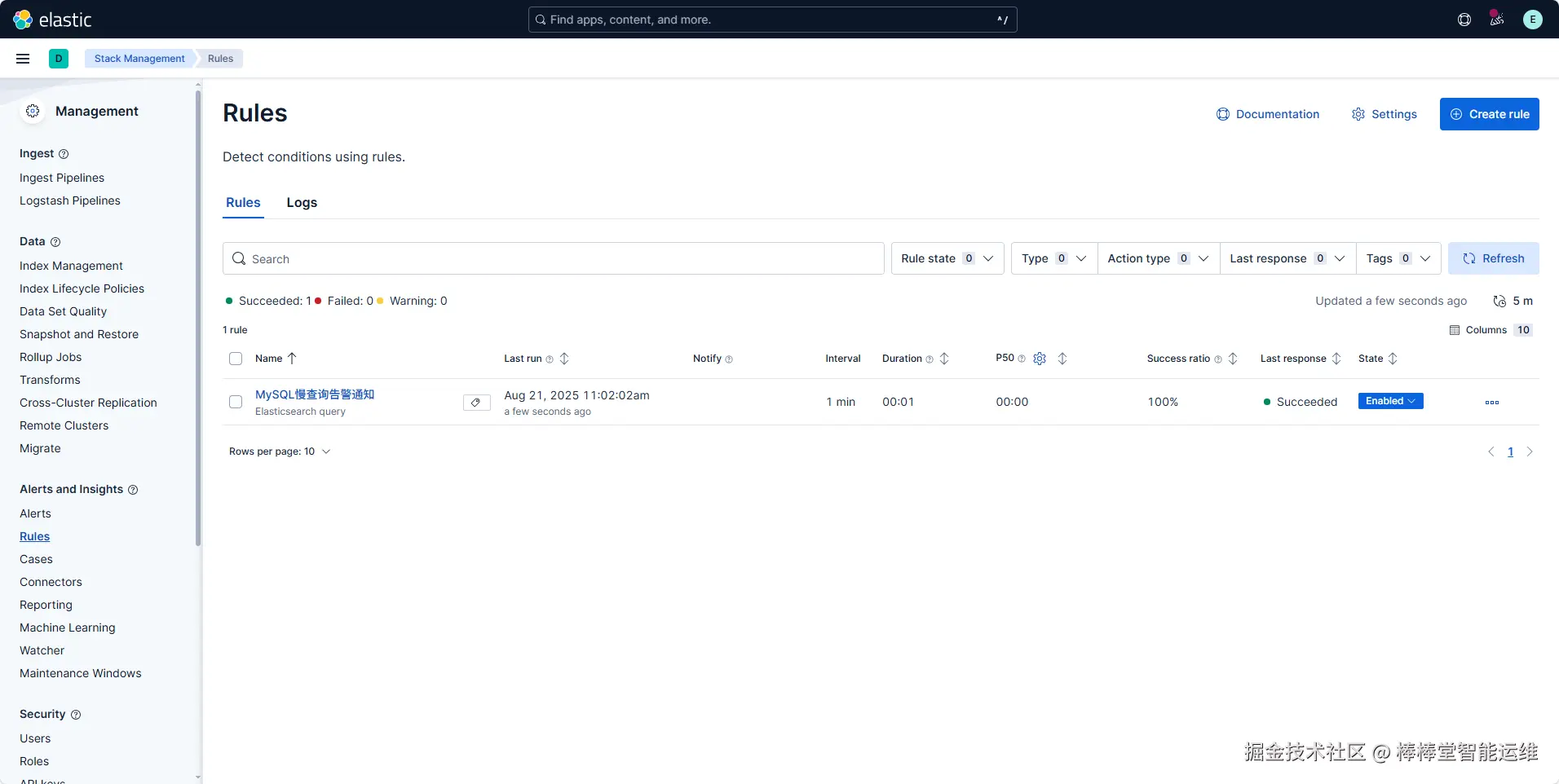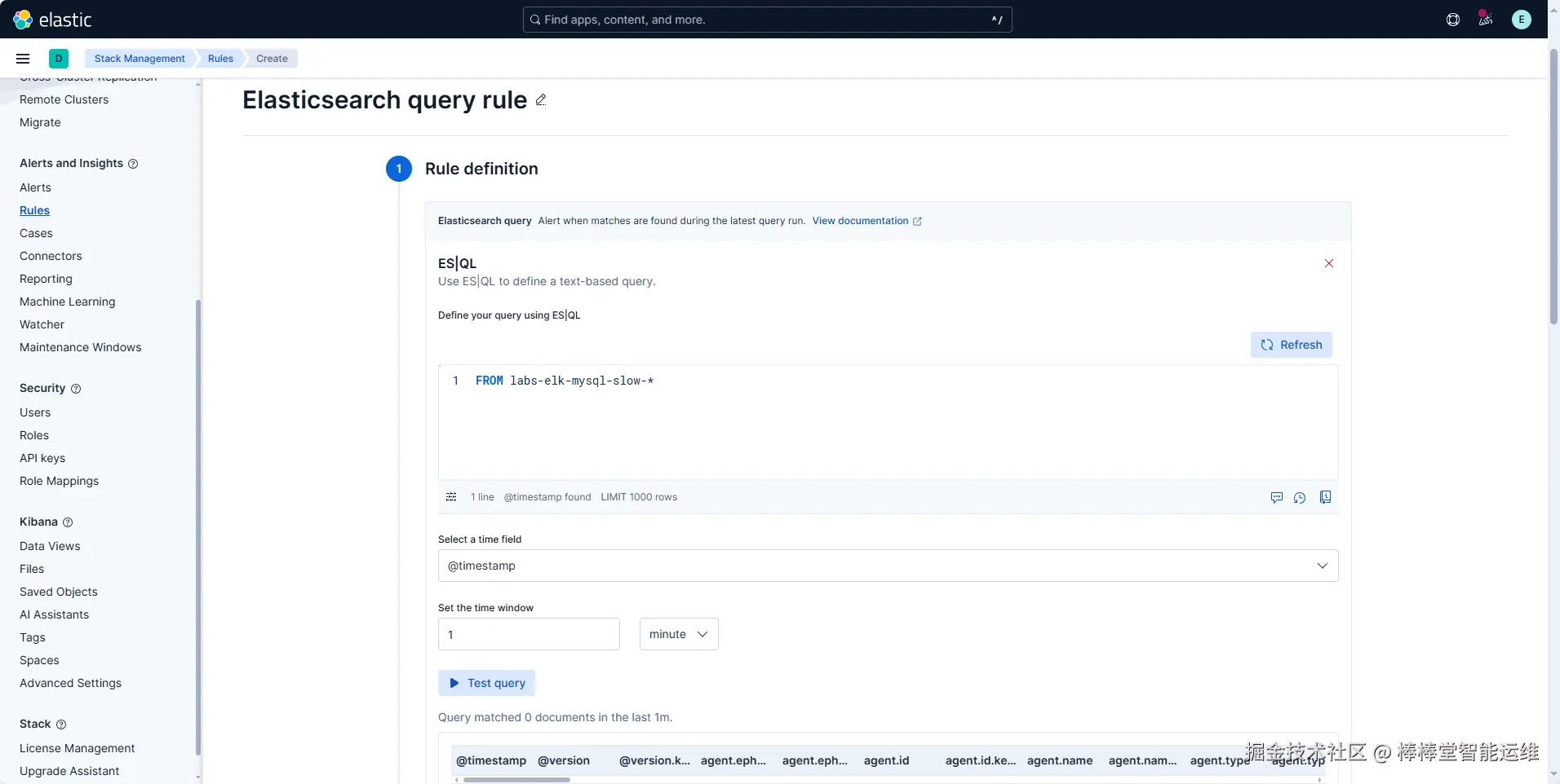 | ES/QL | ES/QL:FROM labs-elk-mysql-slow-*Select a time field:@timestampSet the time window:1minutesRule schedule:1minutesRule scope:Stack Rules | 使用Elasticsearch SQL查询最近1分钟内的MySQL慢查询日志,设置检查警报条件的频率为1分钟 |