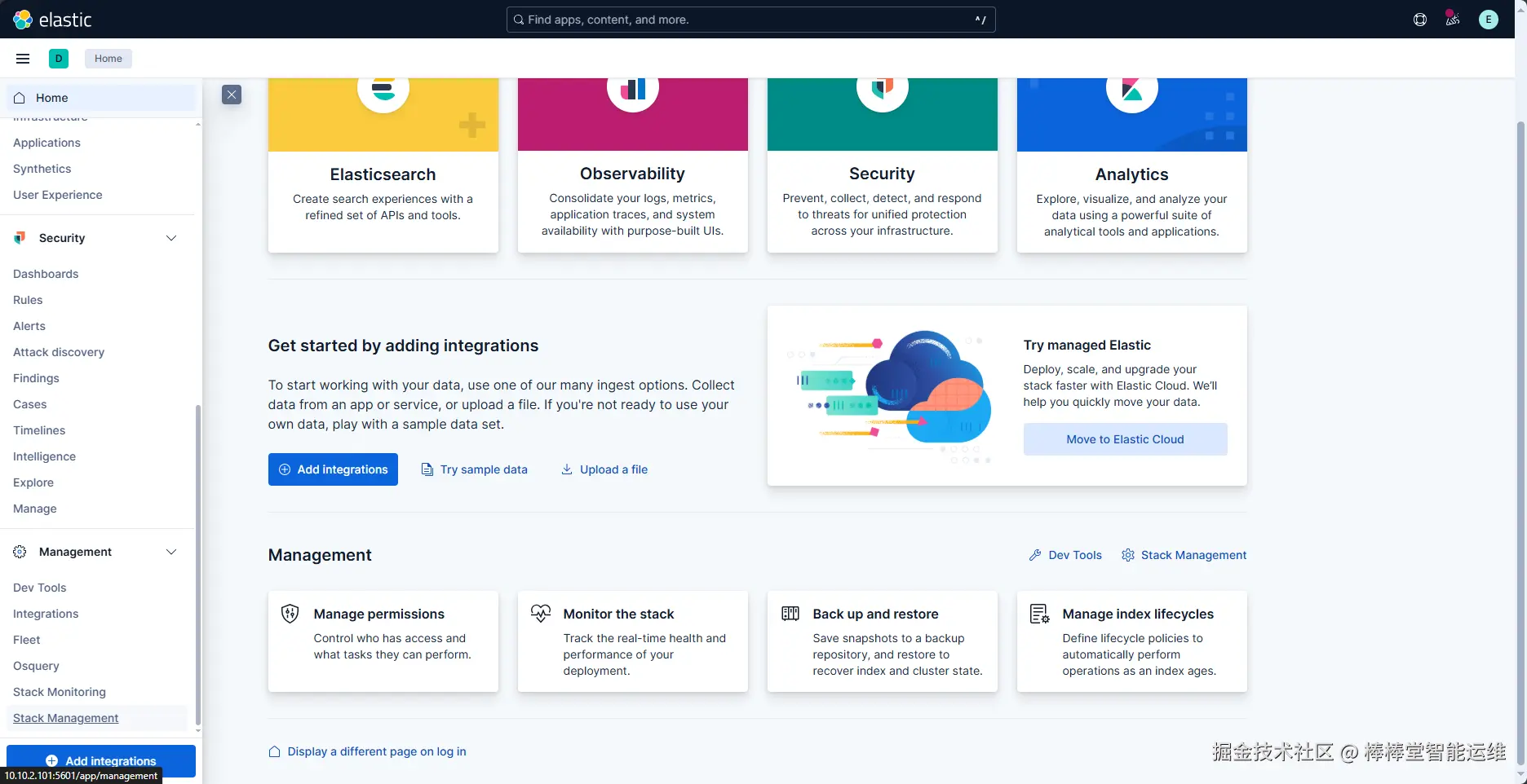(1)使用浏览器访问Kibana地址http://10.10.2.101:5601,输入用户和密码(用户名:elastic,密码:Labs#ELK@2025)登录Kibana,如图3-1所示。