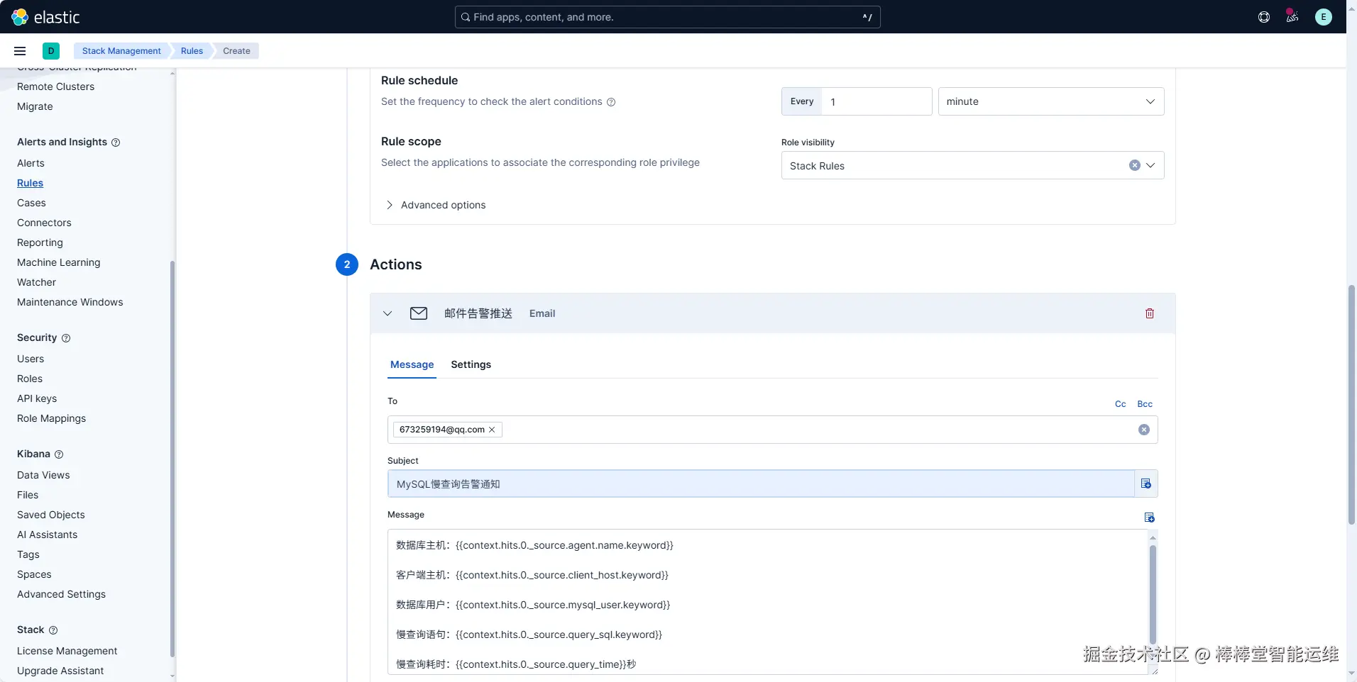 | Actions | Add action:邮件告警推送To:673259194@qq.comSubject:MySQL慢查询告警通知Message:数据库主机:{{context.hits.0._source.agent.name.keyword}}客户端主机:{{context.hits.0._source.client_host.keyword}}数据库用户:{{context.hits.0._source.mysql_user.keyword}}慢查询语句:{{context.hits.0._source.query_sql.keyword}}慢查询耗时:{{context.hits.0._source.query_time}}秒 | 配置触发告警规则的活动为:推送告警邮件,设置邮件接收人、主题和邮件内容 |