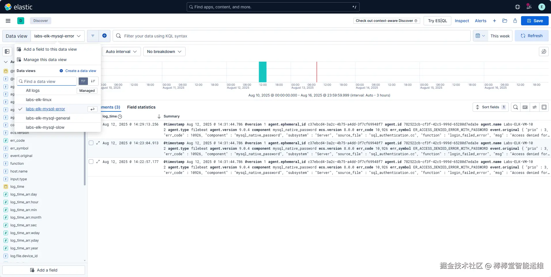 (8)参照上述步骤(4)-(7)创建MySQL错误日志数据视图labs-elk-mysql-error、慢查询日志数据视图labs-elk-mysql-slow,并检索日志,如图3-9所示。
