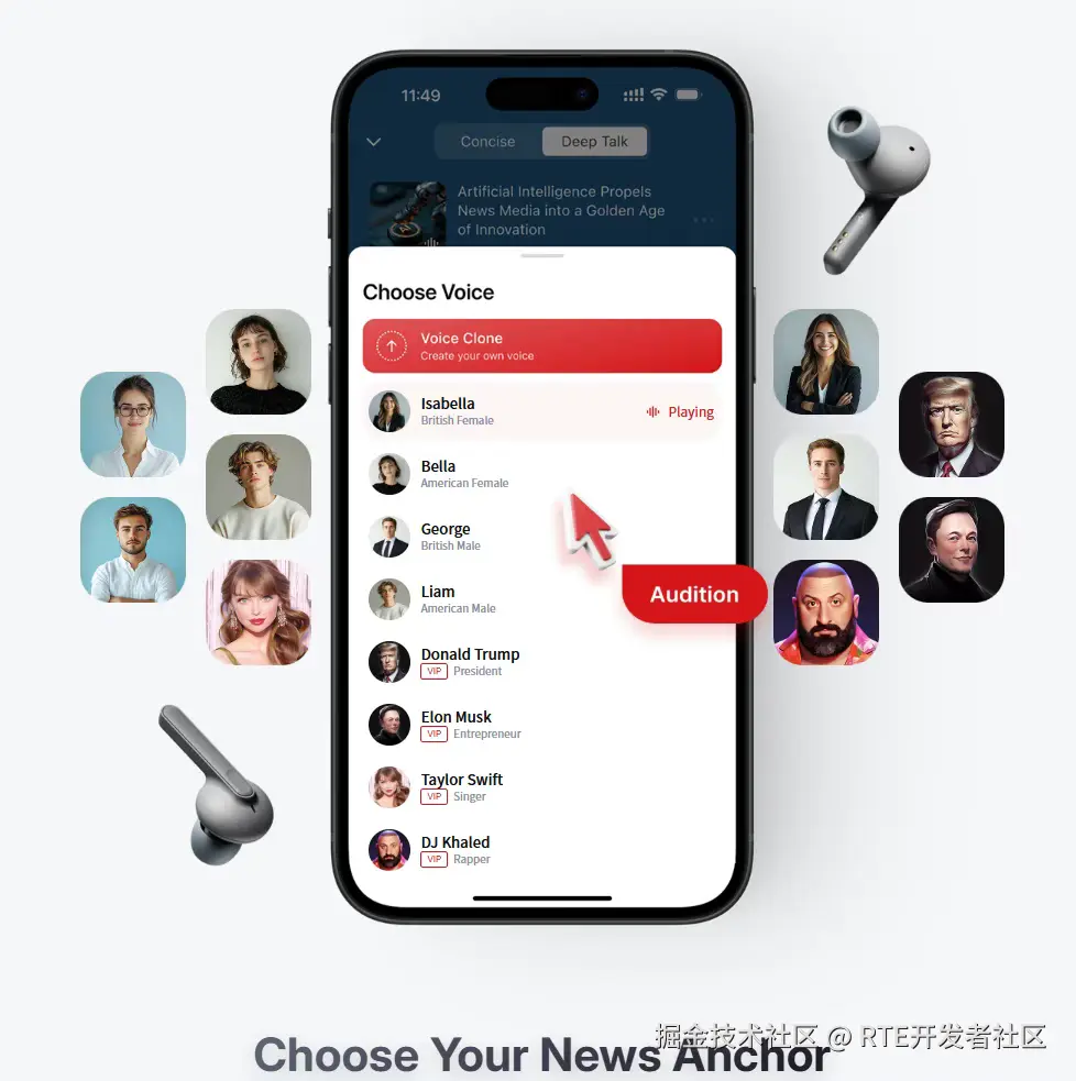 声音克隆与个性化旁白:Informed 提供了独特的语音克隆功能,用户可以选择自己喜欢的声音来播报新闻,甚至可以克隆自己的声音、朋友的声音,或者选择名人声音如 Trump、Taylor 和 Musk 的音色,极大地提升了新闻播报的个性化体验。