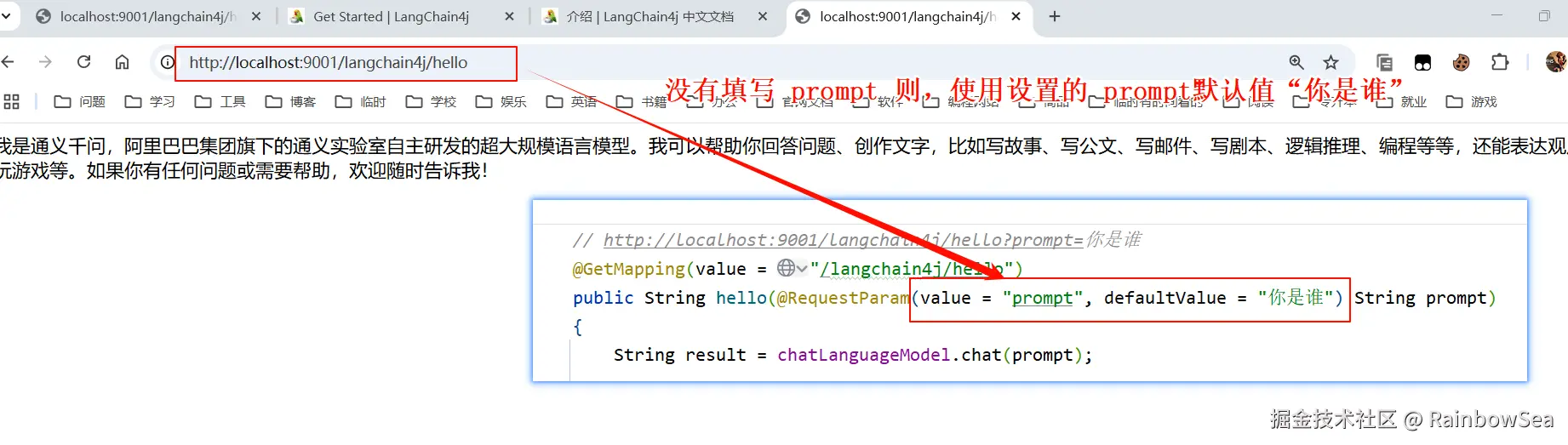 public String hello(@RequestParam(value = "prompt", defaultValue = "你是谁") String prompt)