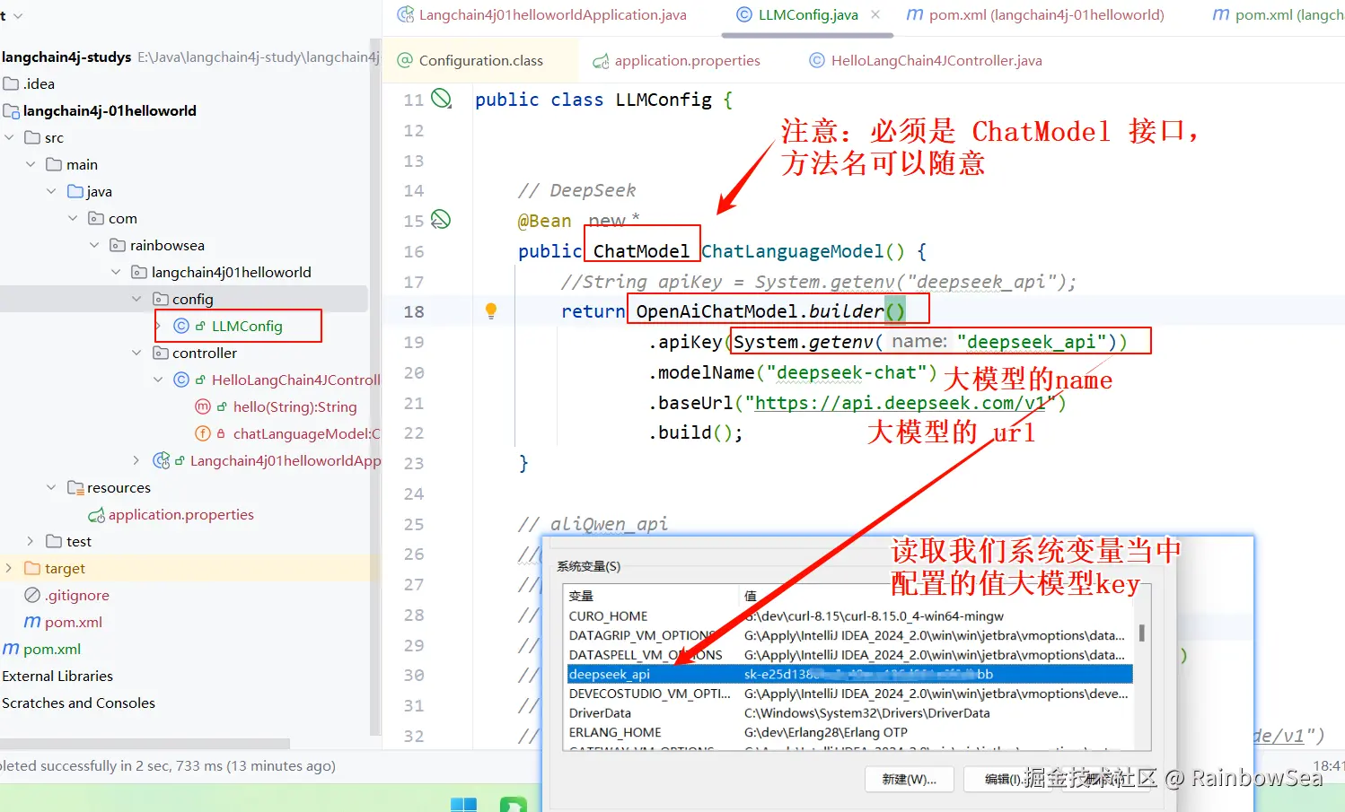 - 第二种方式:就是编写我们的 config 配置类,读取我们系统当中的配置大模型 key 。