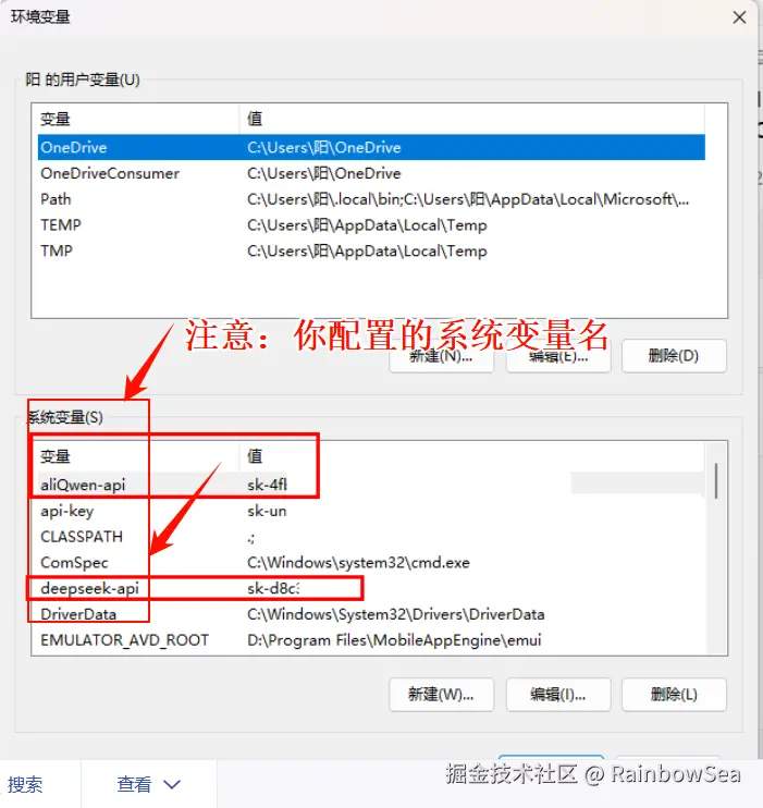 你在系统变量名可以随意,尽量见名之意,不要中文,对应变量名的值,就是你对应大模型的 key 的值。