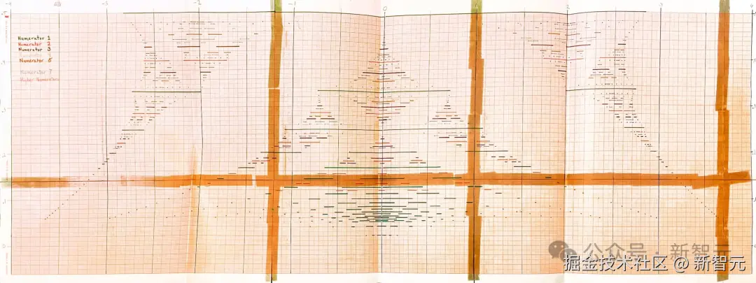 最终,他将这些「能级值」方格纸粘在一起,用笔勾勒出一幅令人惊叹的图案。