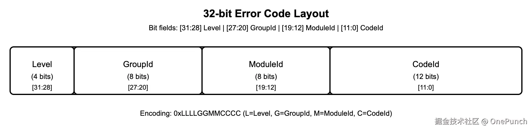 记忆方式很简单:4 / 8 / 8 / 12 = 32。十六进制打印时就是 0xLLLLGGMMCCCC 的形式。