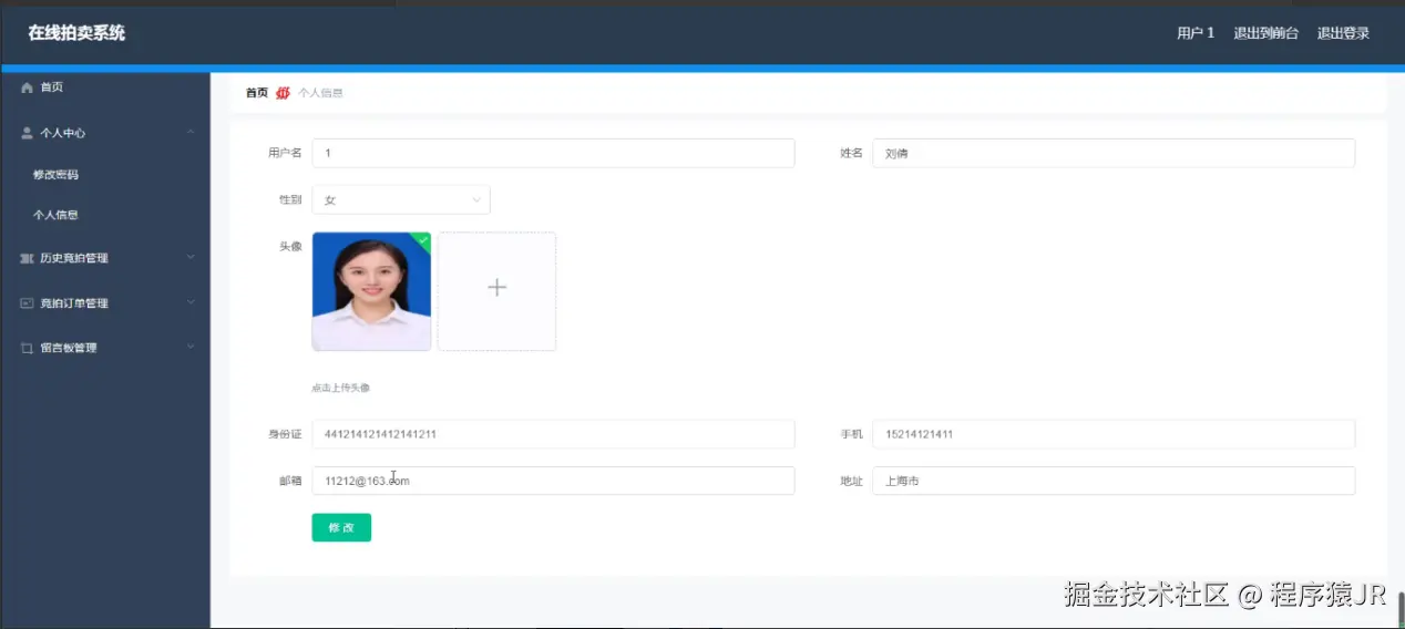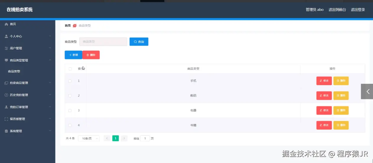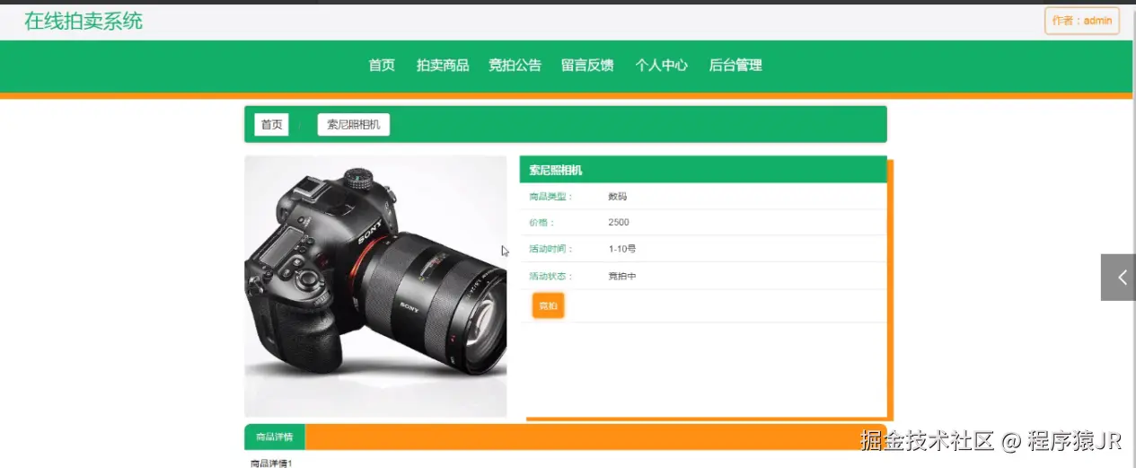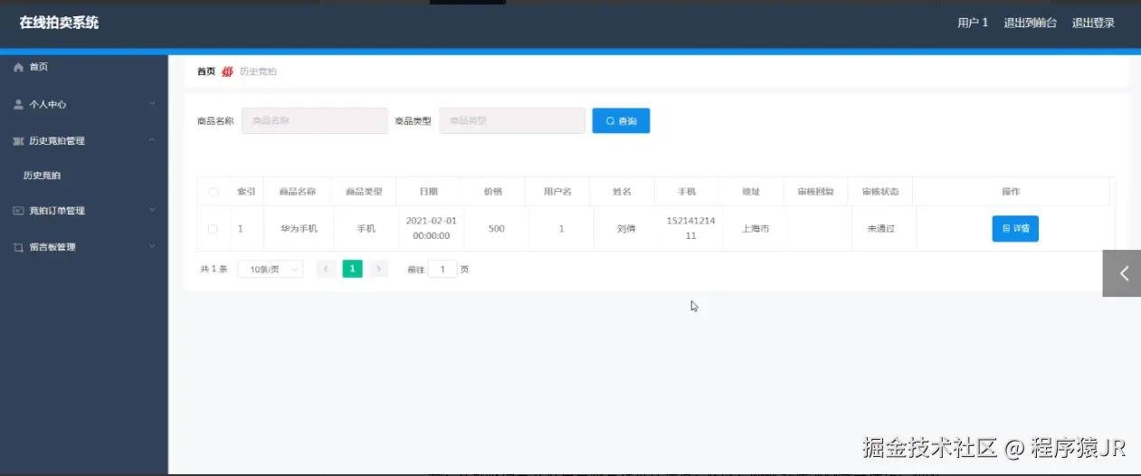 3、功能的完善性:管理员;首页、个人中心、用户管理、商品类型管理、拍卖商品管理、历史竞拍管理、竞拍订单管理、留言板管理、系统管理,用户;首页、个人中心、历史竞拍管理、竞拍订单管理、留言板管理,前台首页;首页、拍卖商品、竞拍公告、留言反馈、个人中心、后台管理模块的修改和维护操作。