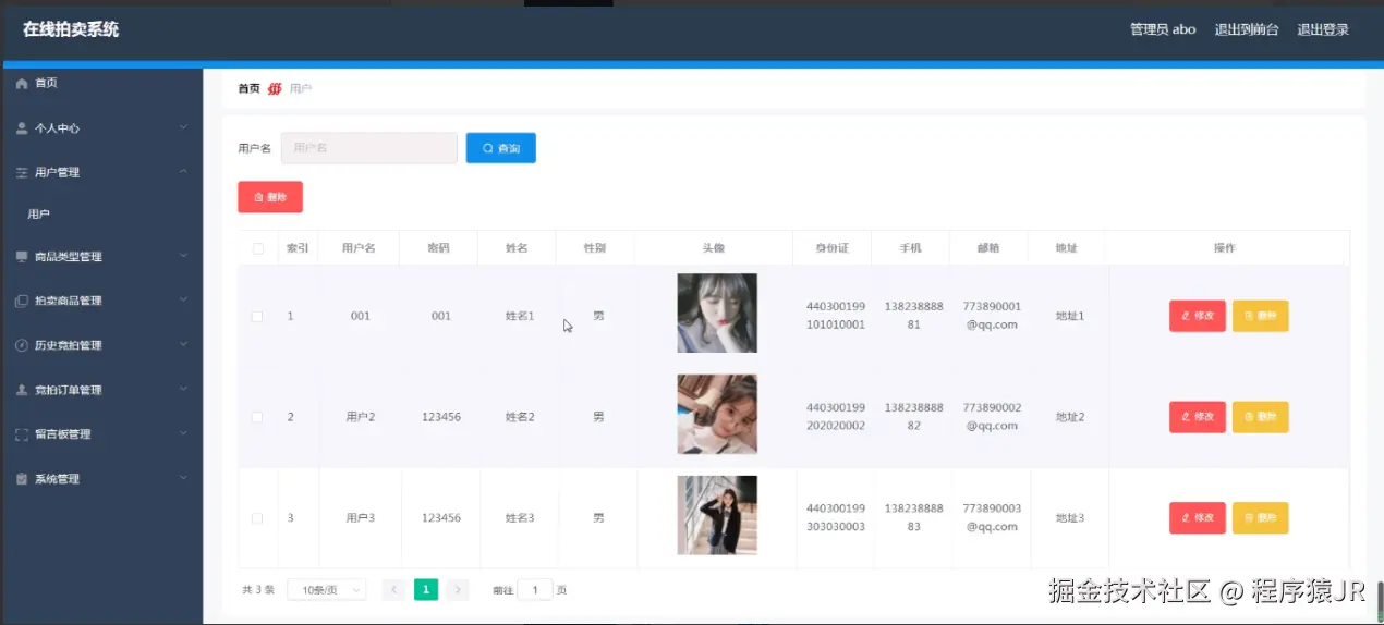 用户管理,在用户管理页面可以填写用户名、密码、姓名、性别、头像、身份证、手机、邮箱、地址等内容,并可根据需要对用户管理进行,修改或删除等操作,如图5-4所示。编辑