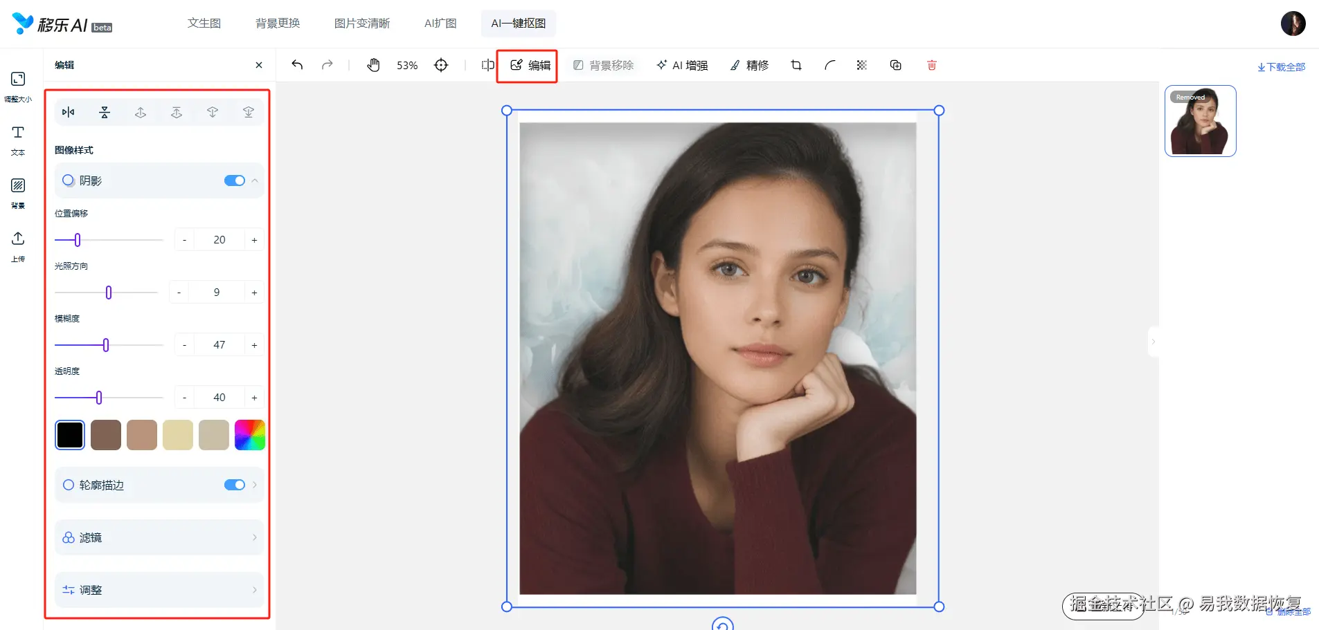 移乐AI一键抠图以“智能+全能”重新定义修图工具,让每个人都能摆脱技术束缚,专注创意表达。无论是紧急工作需求,还是日常灵感记录,它都是你口袋里的“设计外挂”。立即体验:前往移乐AI网站,解锁你的第一张AI视觉大片!