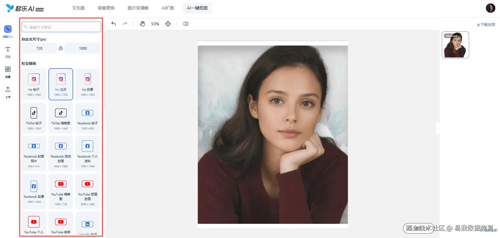 预设社交尺寸:内置抖音、ins、小红书、Facebook、电商主图等近40种常见平台尺寸模板,无需手动计算比例。