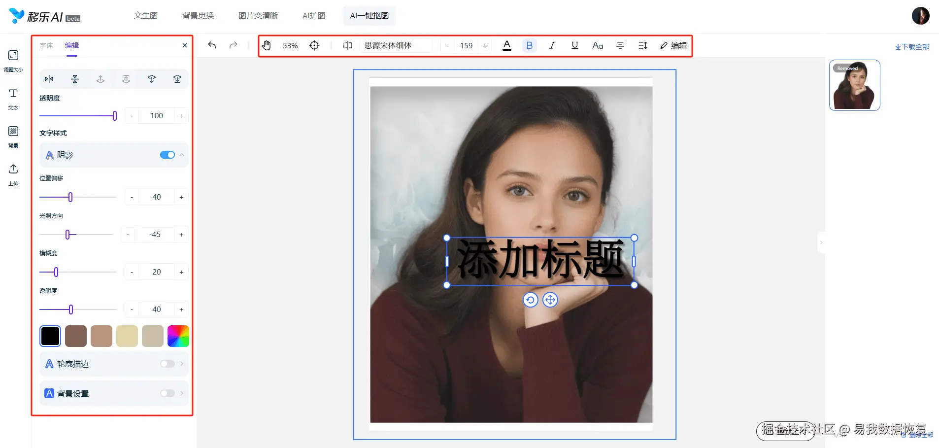 特效加持:支持文字水平垂直翻转、透明度、阴影、描边、背景色块等艺术效果,轻松打造标题党、海报标语。