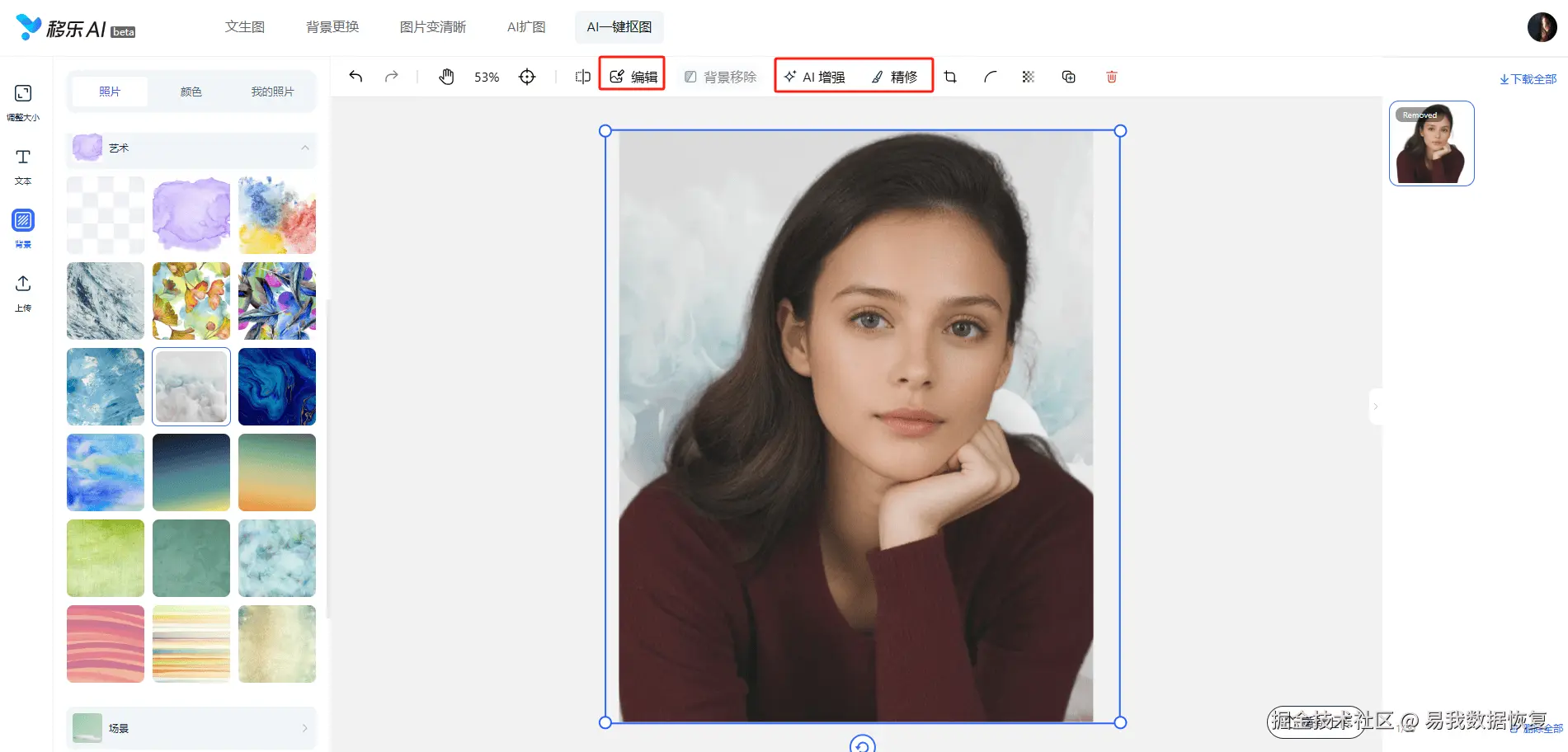 在社交媒体时代,一张高质量的图片往往能决定内容的传播力,但传统修图软件操作繁琐、功能分散,专业设计师的高门槛更让普通人望而却步。移乐AI最新推出的免费「AI一键抠图」工具,以“智能化+全功能”为核心,重新定义了修图体验——无需PS基础,上传图片即可自动抠图,更集成尺寸调整、文本艺术、背景替换、智能修图等一站式功能,让每个人都能轻松创作出专业级视觉作品。