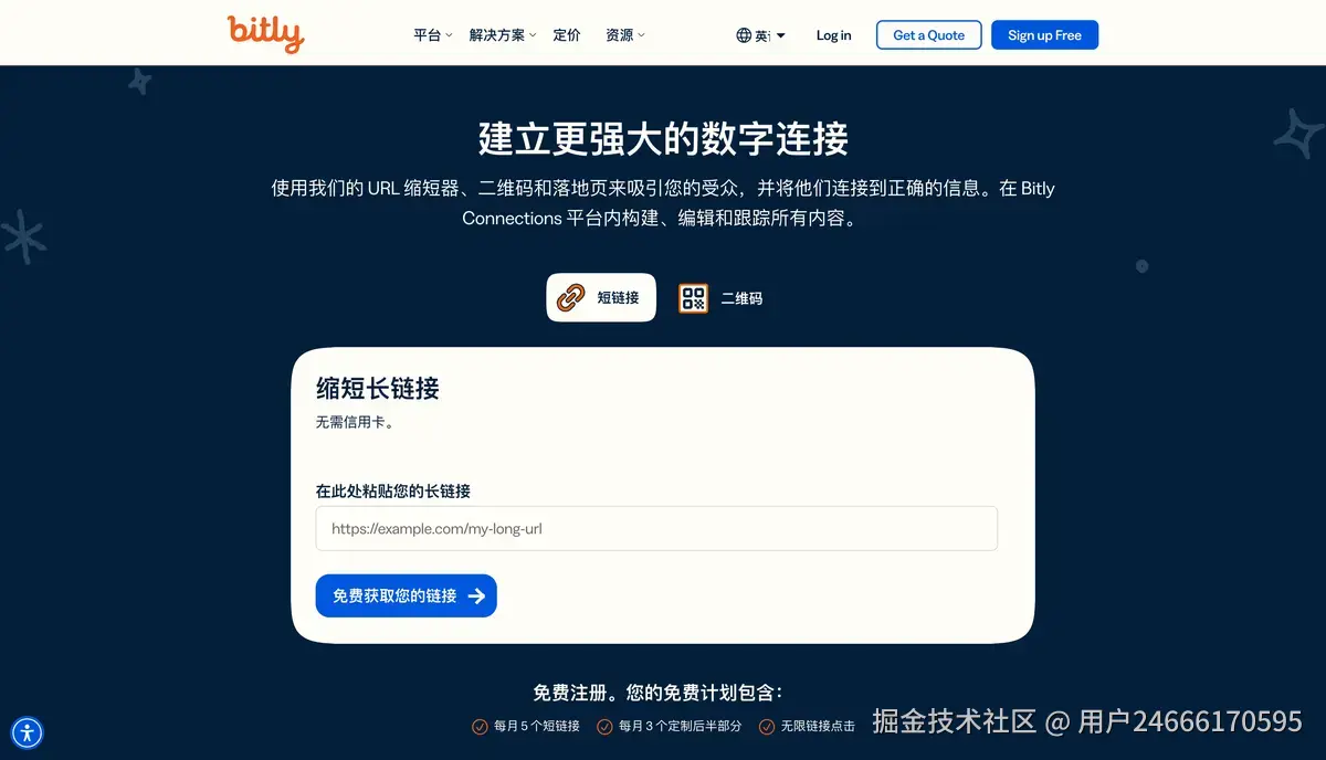 优点:每月5个免费链接,支持生成短网址、生成二维码,国外老牌,支持全球五种语言,暂不支持中文。