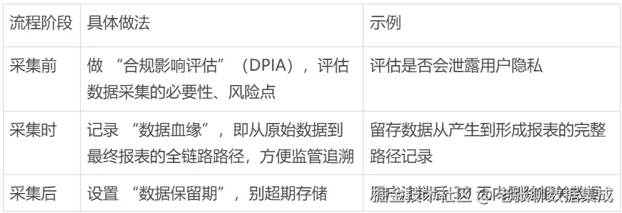 - **《个人信息保护法》**:明确 “最小必要原则”(只采集和业务直接相关的数据)、“告知 - 同意原则”(采集前告诉用户用途,获得明确同意);